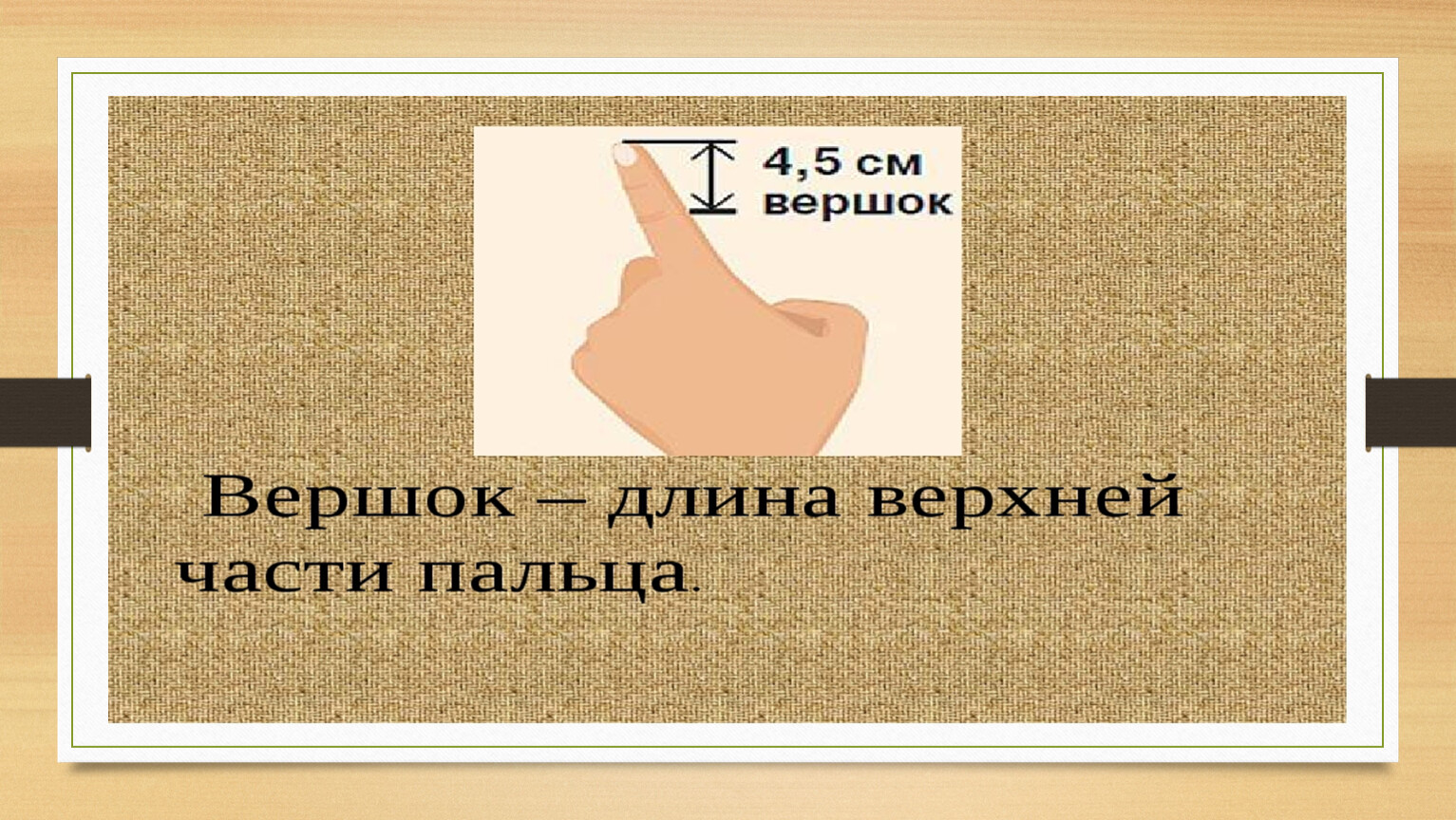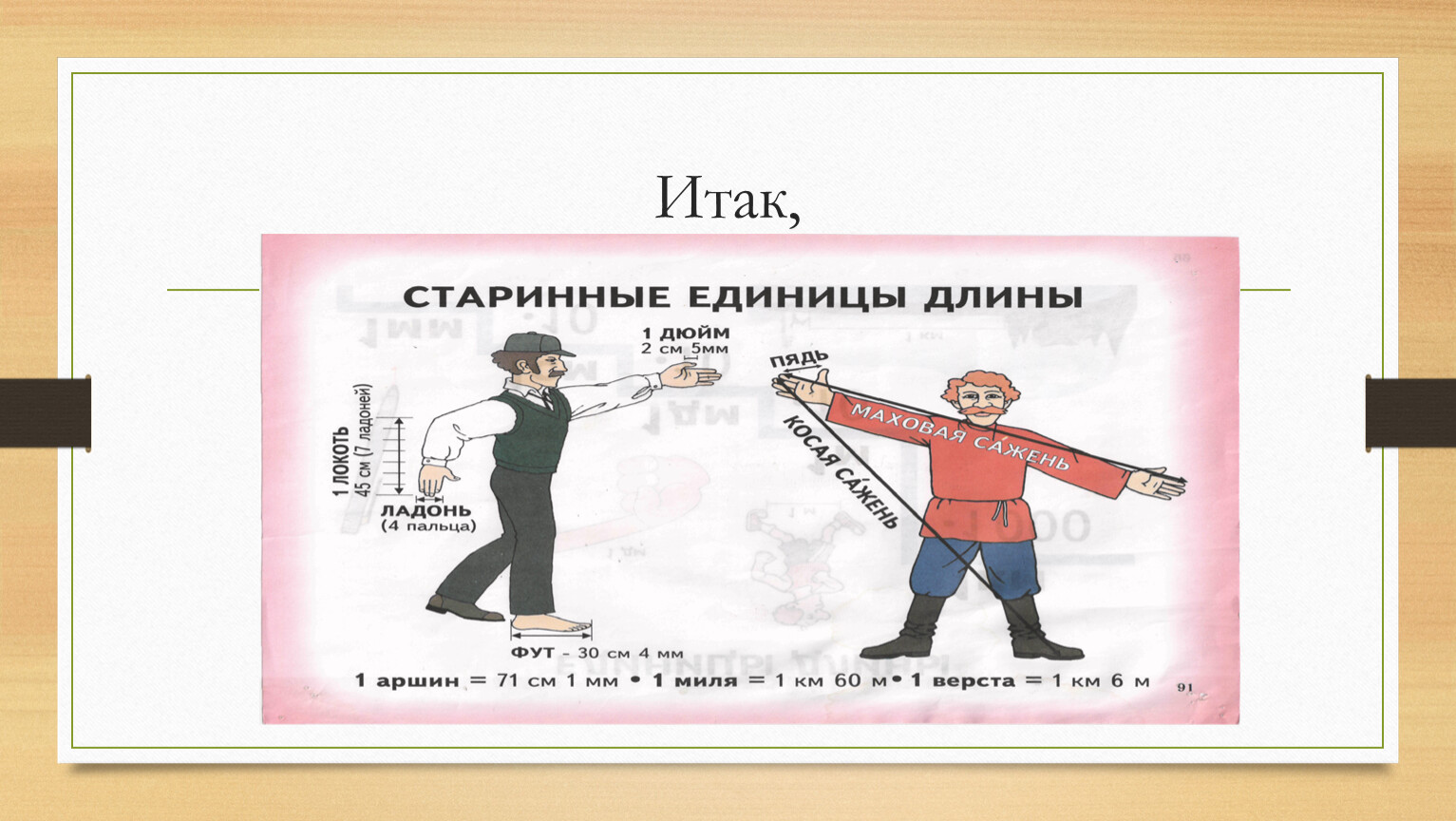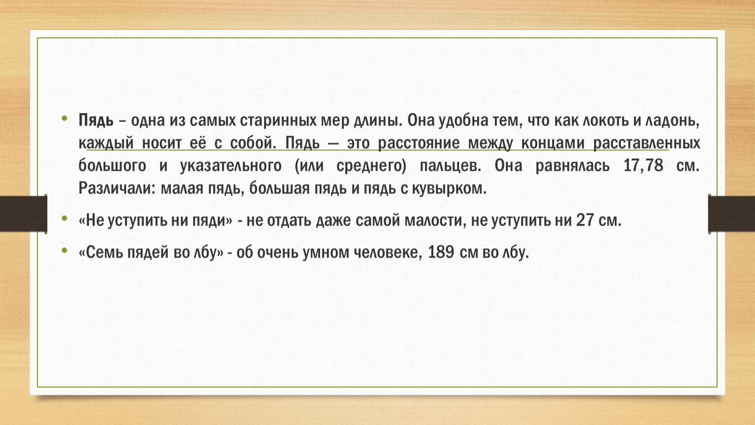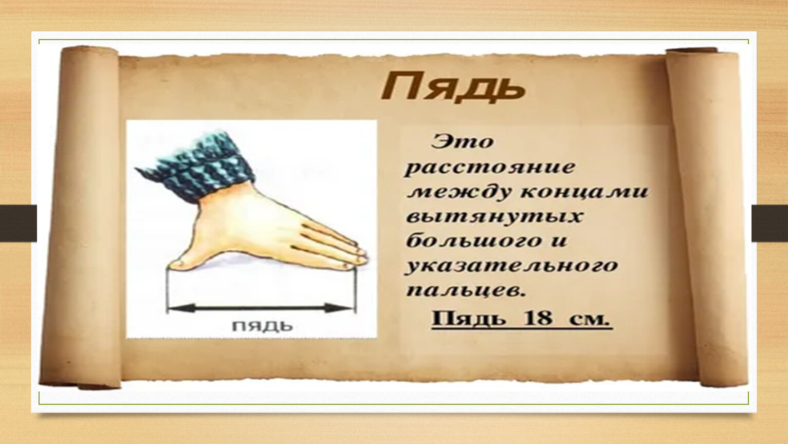 Система древнерусских мер длины включала в себя следующие основные меры: версту, сажень, аршин, локоть, пядь и вершок.