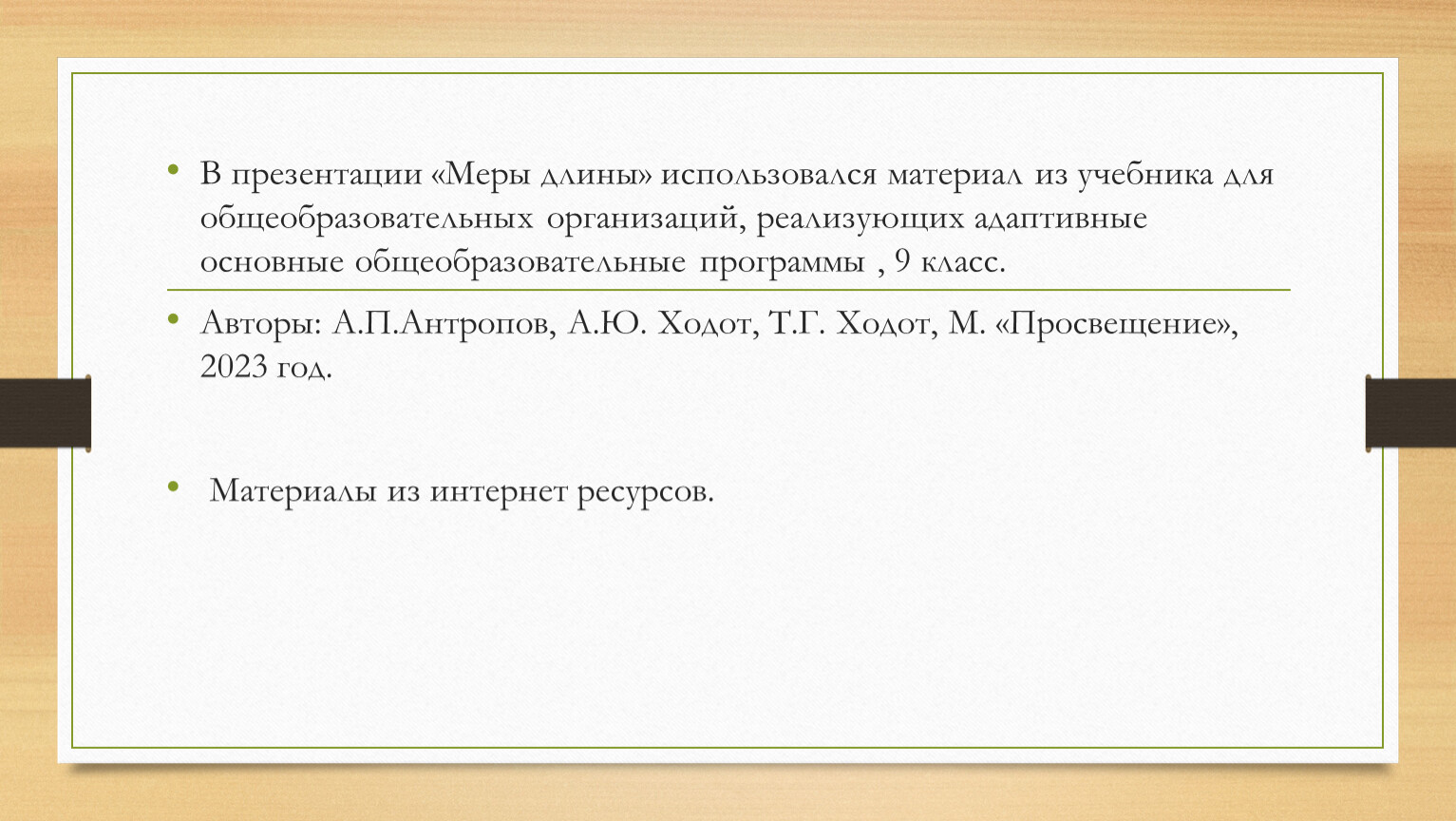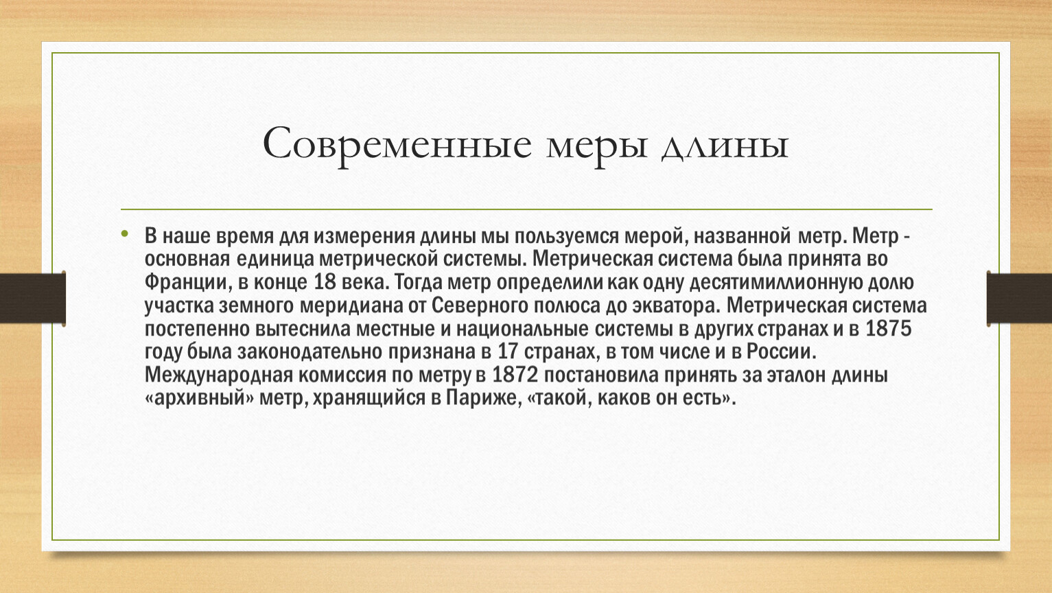 В наше время для измерения длины мы пользуемся мерой, названной метр. Метр - основная единица метрической системы. Метрическая система была принята во Франции, в конце 18 века. Тогда метр определили как одну десятимиллионную долю участка земного меридиана от Северного полюса до экватора. Метрическая система постепенно вытеснила местные и национальные системы в других странах и в 1875 году была законодательно признана в 17 странах, в том числе и в России. Международная комиссия по метру в 1872 постановила принять за эталон длины «архивный» метр, хранящийся в Париже, «такой, каков он есть».