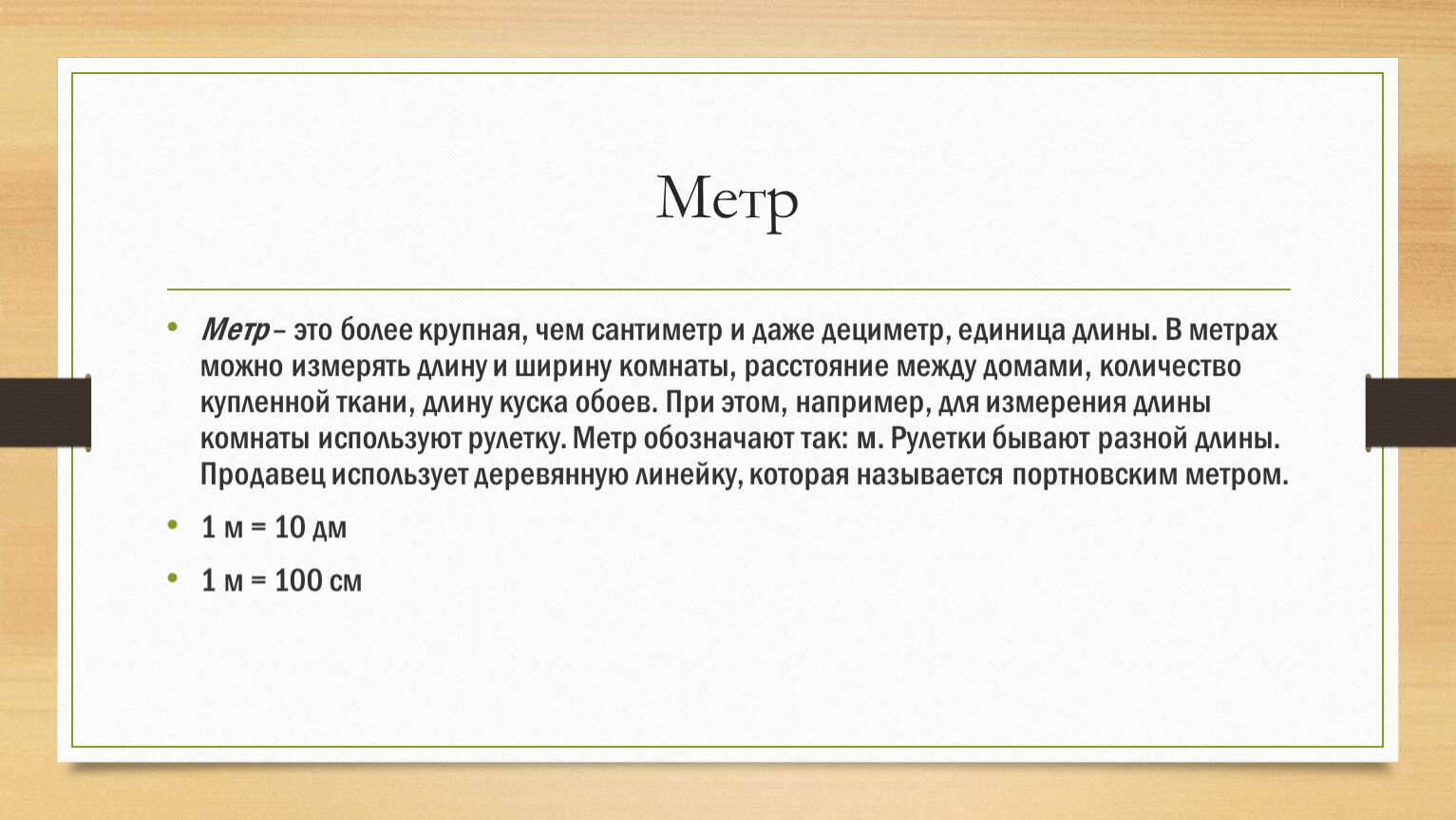 Метр – это более крупная, чем сантиметр и даже дециметр, единица длины. В метрах можно измерять длину и ширину комнаты, расстояние между домами, количество купленной ткани, длину куска обоев. При этом, например, для измерения длины комнаты используют рулетку. Метр обозначают так: м. Рулетки бывают разной длины. Продавец использует деревянную линейку, которая называется портновским метром.