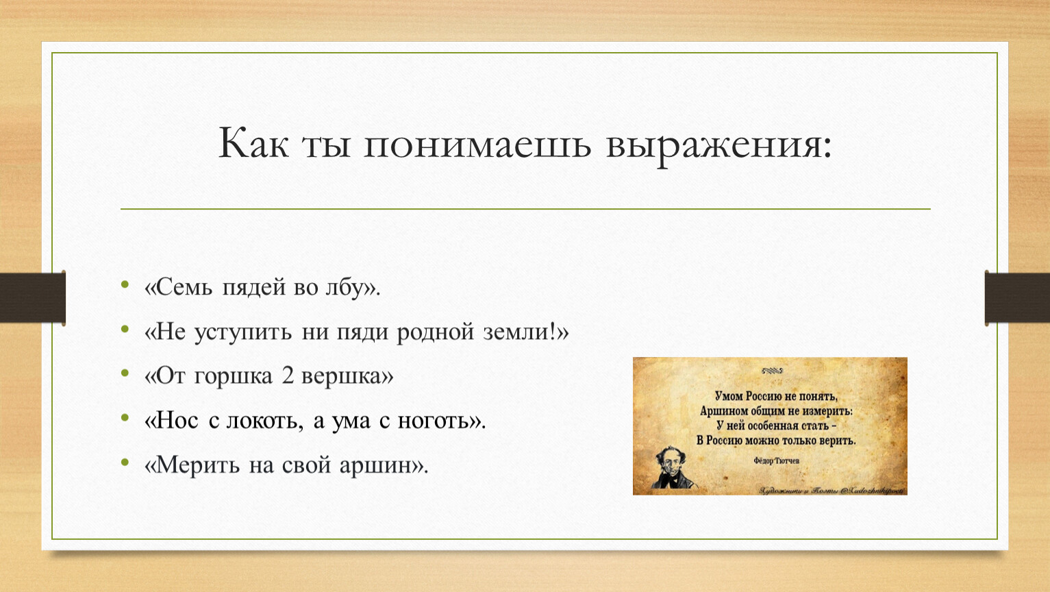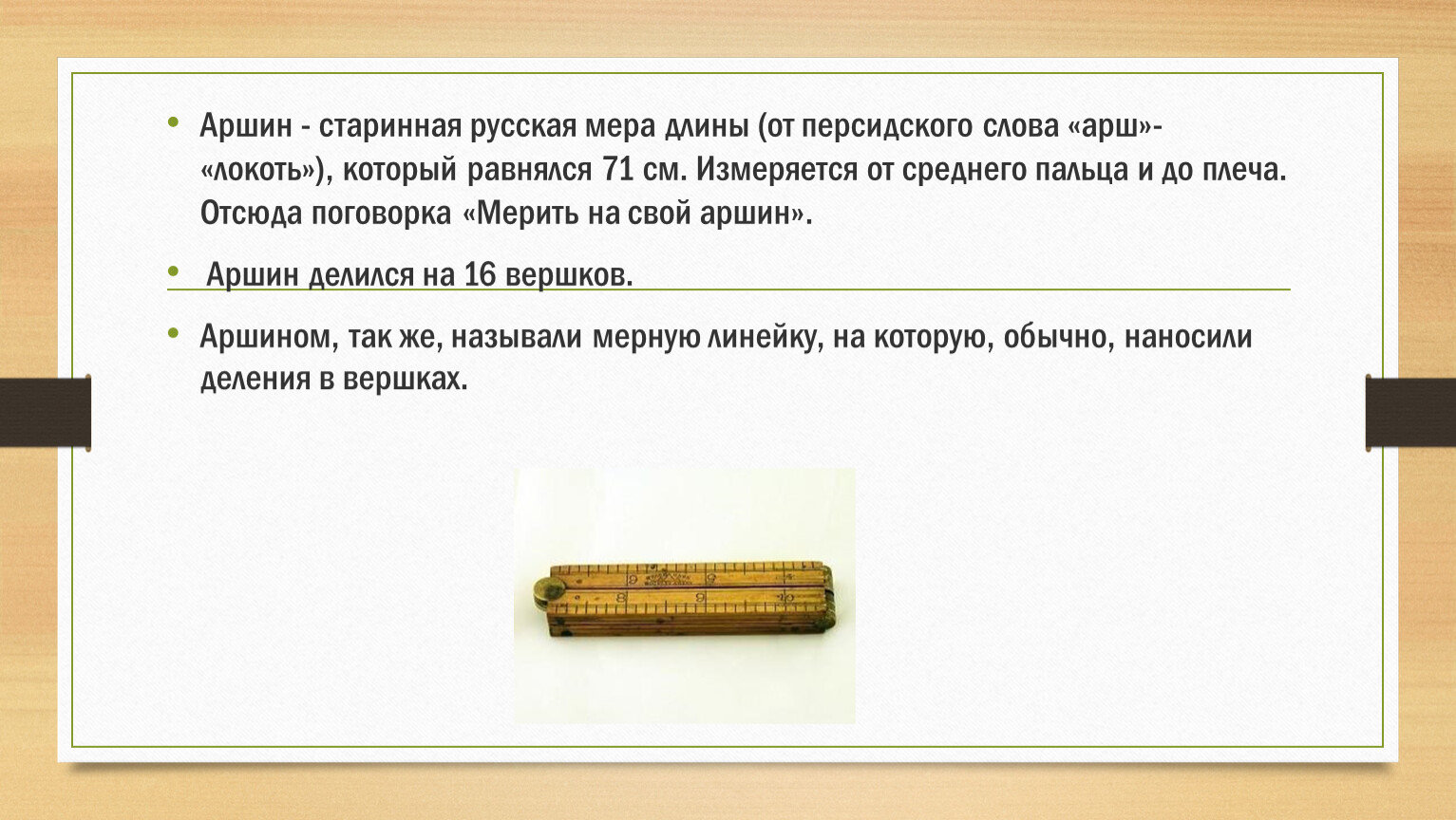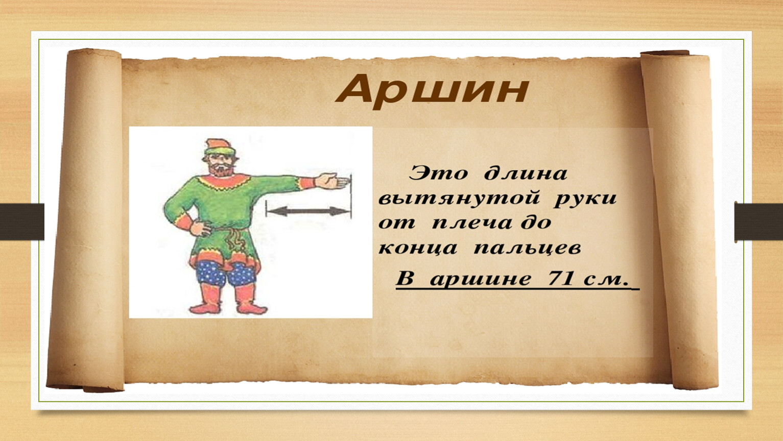 Аршин - старинная русская мера длины (от персидского слова «арш»- «локоть»), который равнялся 71 см. Измеряется от среднего пальца и до плеча. Отсюда поговорка «Мерить на свой аршин».