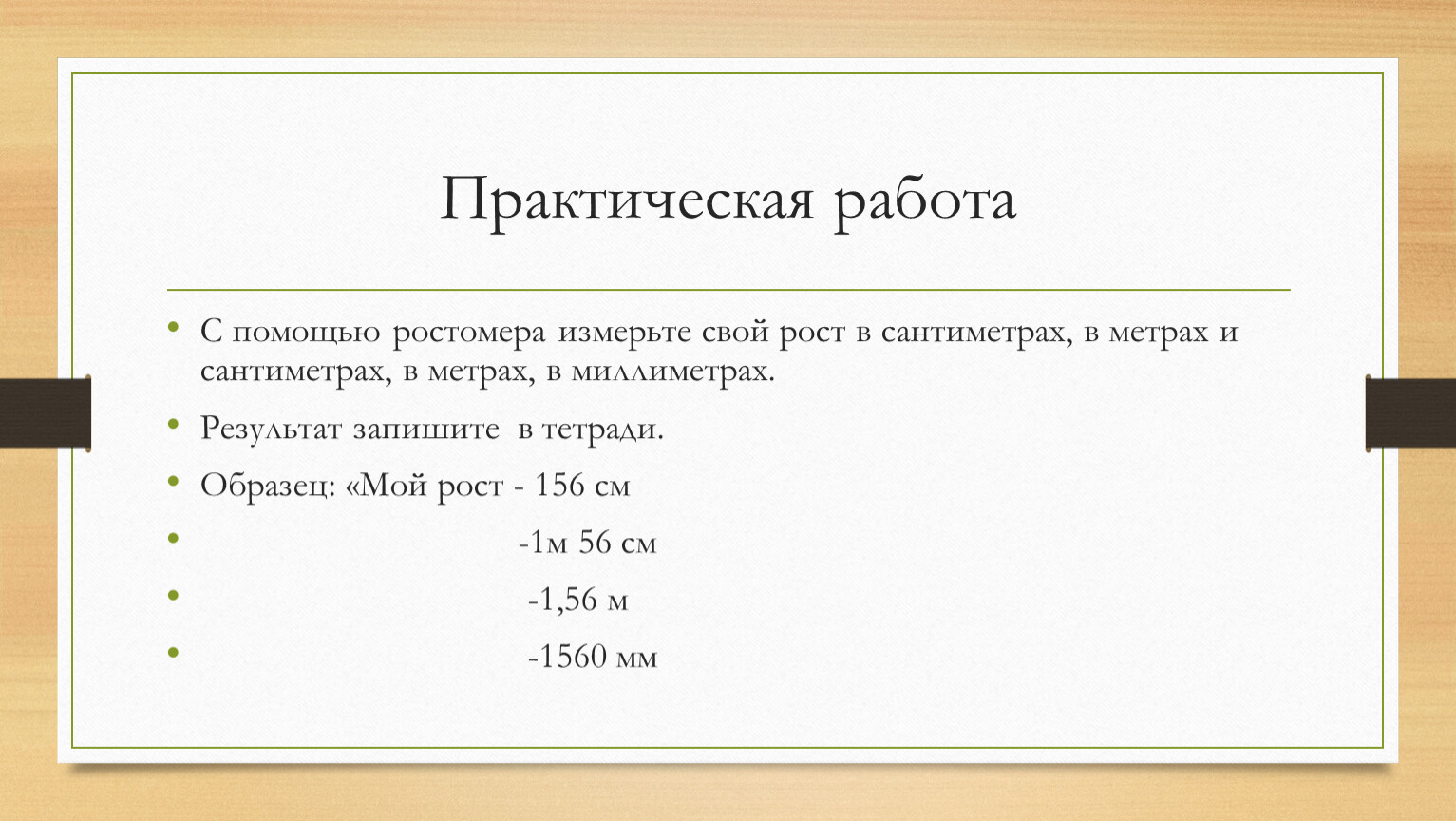С помощью ростомера измерьте свой рост в сантиметрах, в метрах и сантиметрах, в метрах, в миллиметрах.