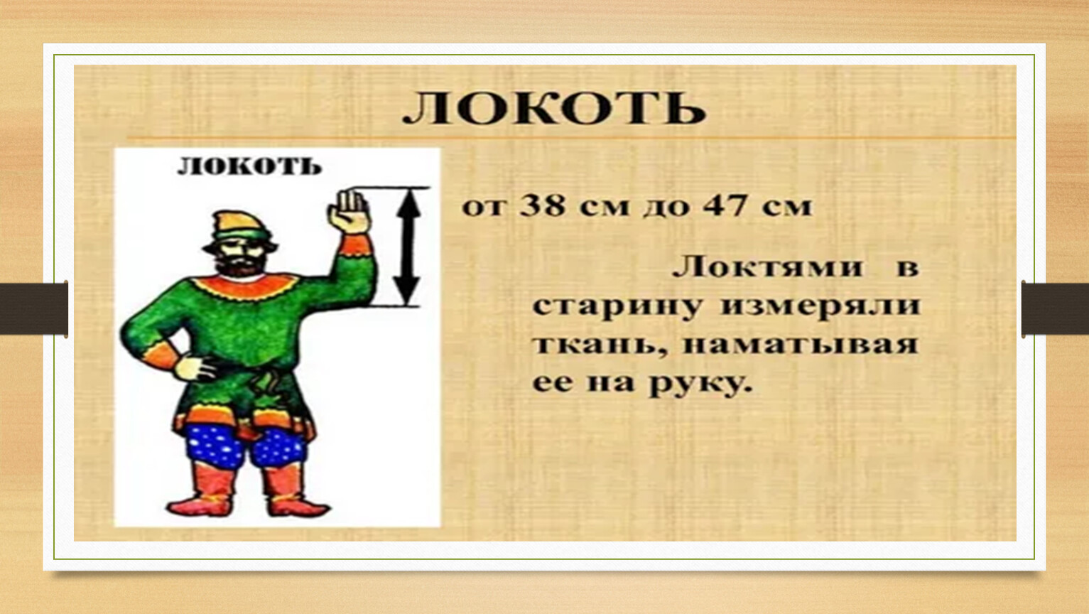 локоть - исконно древнерусская мера длины, известная уже в 11 веке, равнялся длине руки от пальцев до локтя по прямой. Величина этой древнейшей меры длины, по разным источникам, составляла от 38 до 47 см. С 16-го века постепенно вытесняется аршином и в 19 веке почти не употребляется.