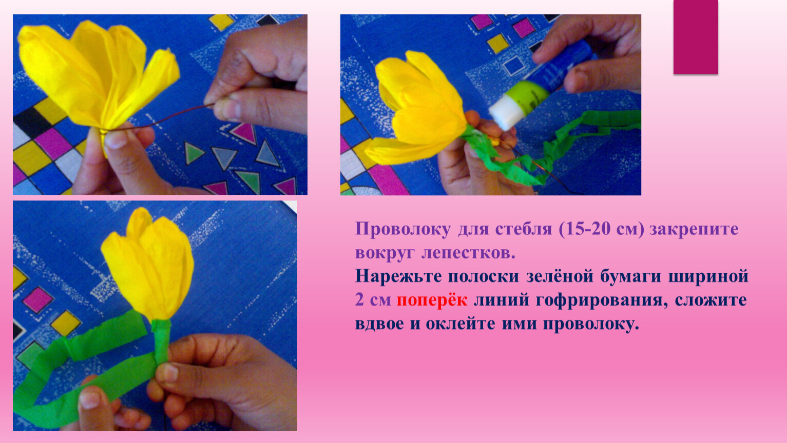 Проволоку для стебля (15-20 см) закрепите вокруг лепестков.