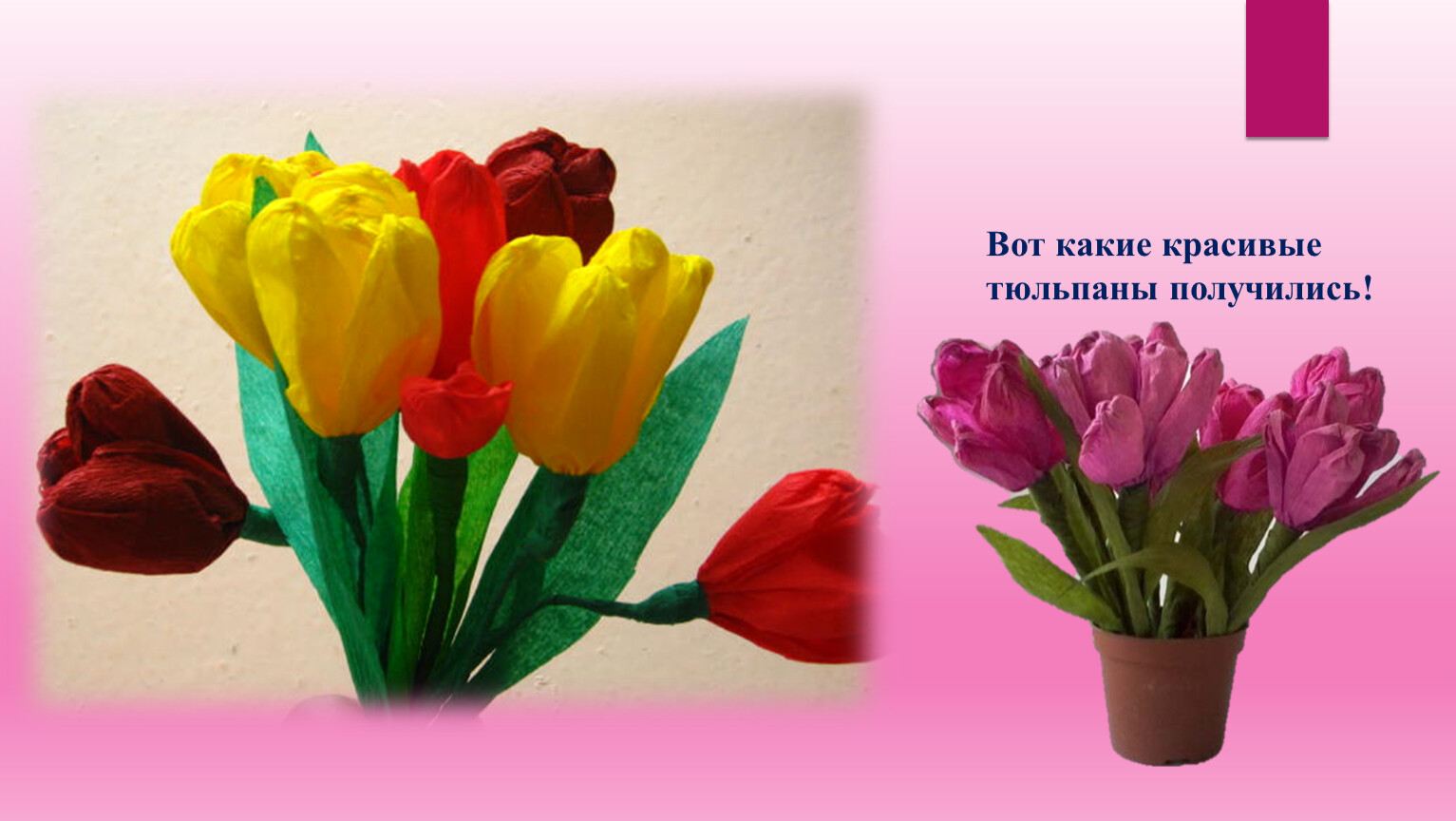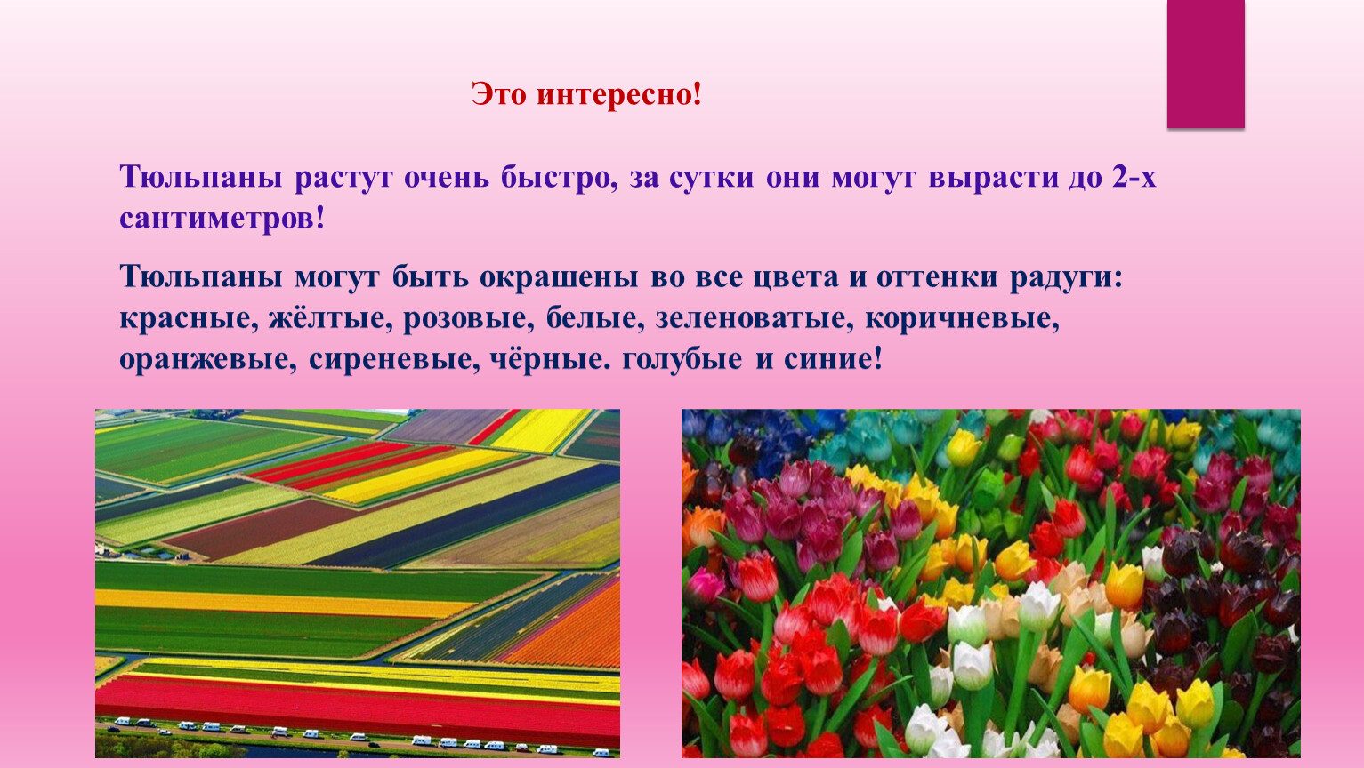 Тюльпаны могут быть окрашены во все цвета и оттенки радуги: красные, жёлтые, розовые, белые, зеленоватые, коричневые, оранжевые, сиреневые, чёрные. голубые и синие!