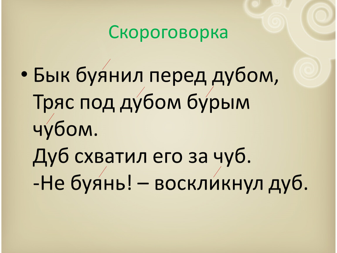 Бык буянил перед дубом,Тряс под дубом бурым чубом.Дуб схватил его за чуб.-Не буянь! – воскликнул дуб.