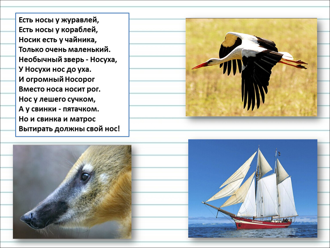 Есть носы у журавлей,Есть носы у кораблей,Носик есть у чайника,Только очень маленький.Необычный зверь - Носуха,У Носухи нос до уха.И огромный НосорогВместо носа носит рог.Нос у лешего сучком,А у свинки - пятачком.Но и свинка и матросВытирать должны свой нос!