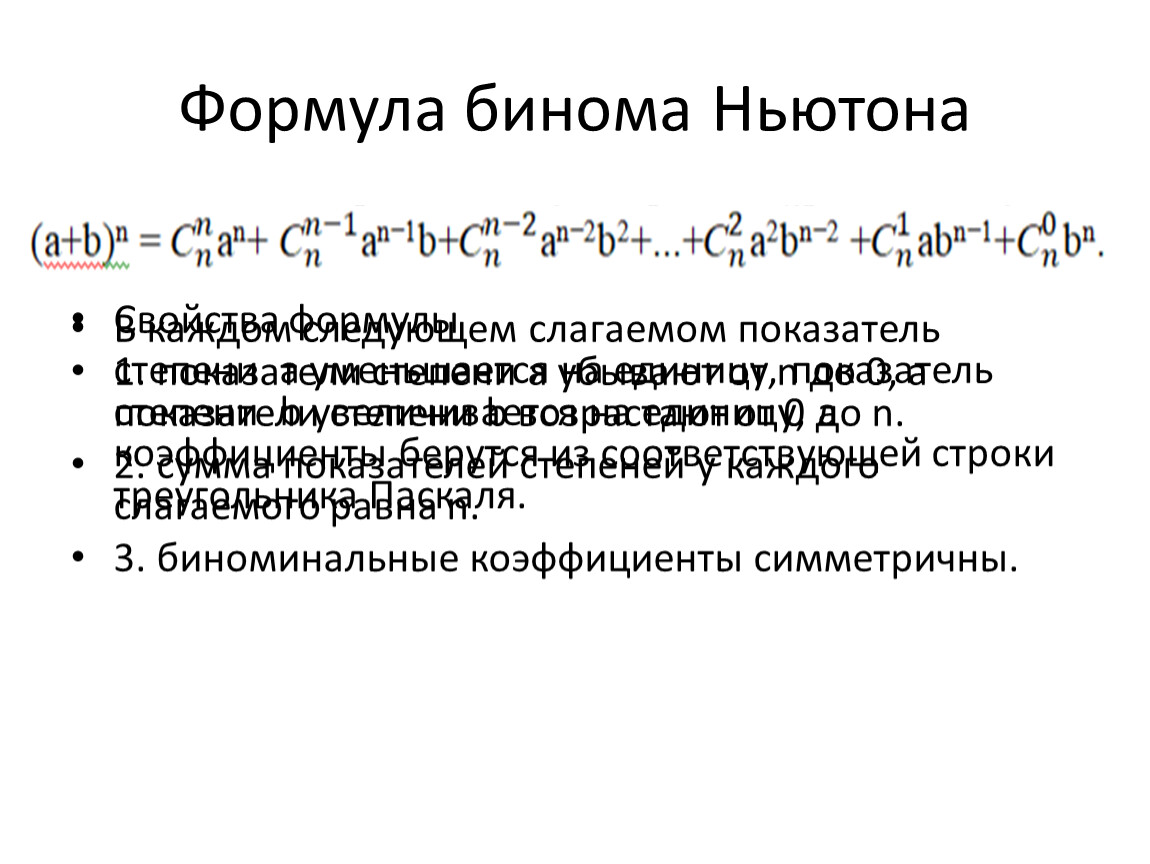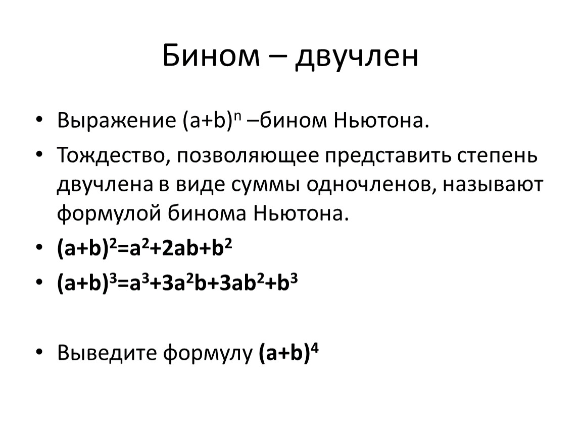 Тождество, позволяющее представить степень двучлена в виде суммы одночленов, называют формулой бинома Ньютона.