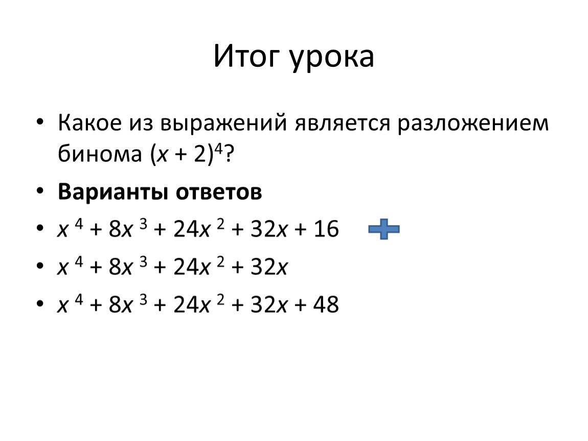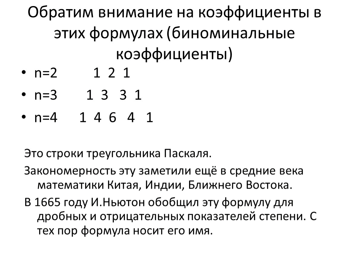 Обратим внимание на коэффициенты в этих формулах (биноминальные коэффициенты)