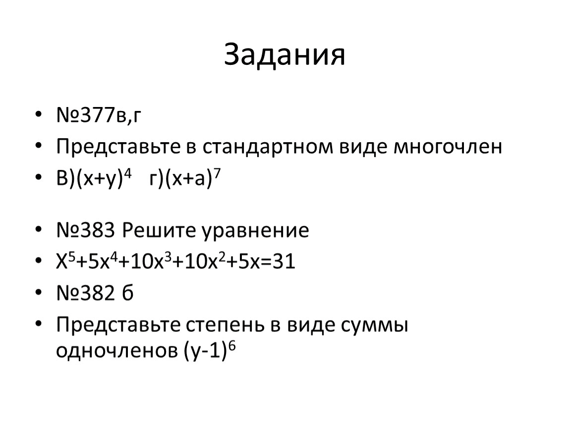 В каждом следующем слагаемом показатель степени a уменьшается на единицу, показатель степени b увеличивается на единицу, а коэффициенты берутся из соответствующей строки треугольника Паскаля.