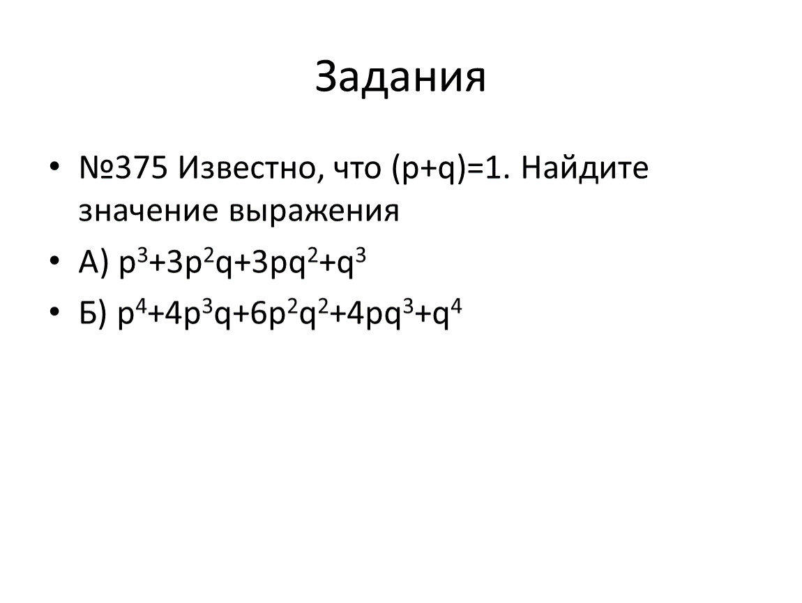 №375 Известно, что (p+q)=1. Найдите значение выражения
