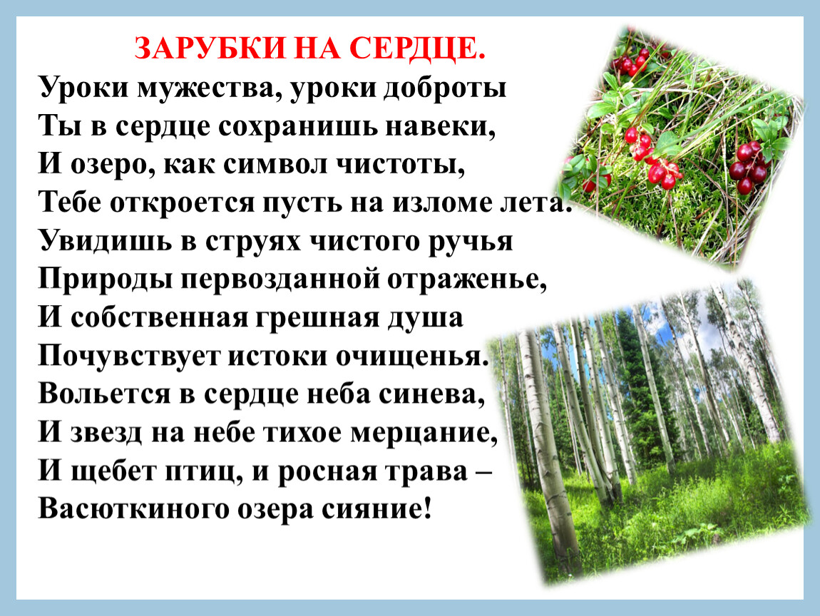 Уроки мужества, уроки добротыТы в сердце сохранишь навеки, И озеро, как символ чистоты,Тебе откроется пусть на изломе лета.Увидишь в струях чистого ручья Природы первозданной отраженье,И собственная грешная душаПочувствует истоки очищенья.Вольется в сердце неба синева,И звезд на небе тихое мерцание,И щебет птиц, и росная трава –