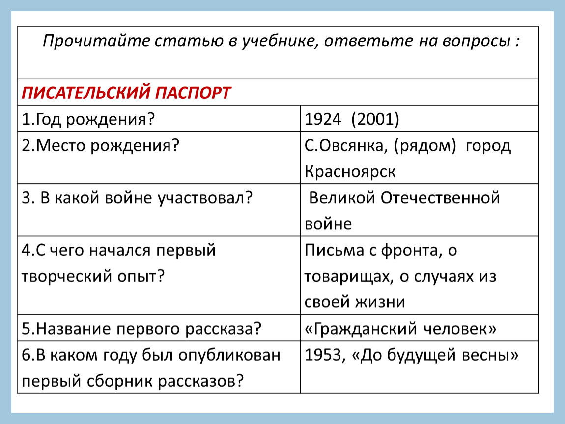 2.Место рождения? | С.Овсянка, (рядом) город |
