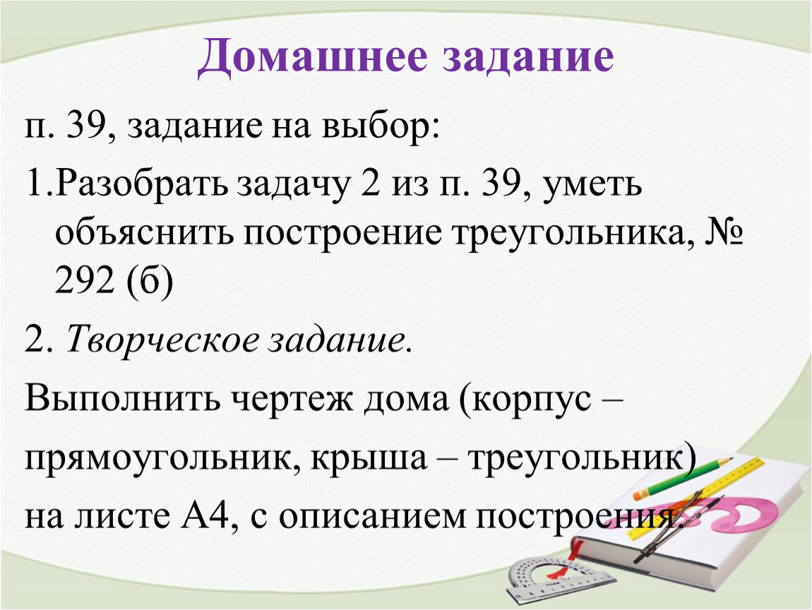 1.Разобрать задачу 2 из п. 39, уметь объяснить построение треугольника, № 292 (б)