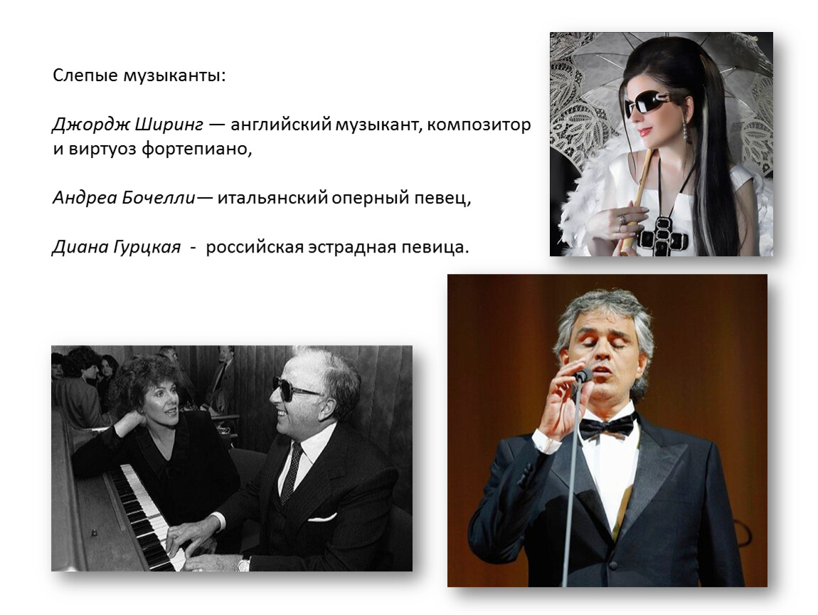 Существуют специальные учебные заведения для слепых и слабовидящих: общеобразовательные, профессионально-технические школы, музыкальные училища, школы массажистов и др.