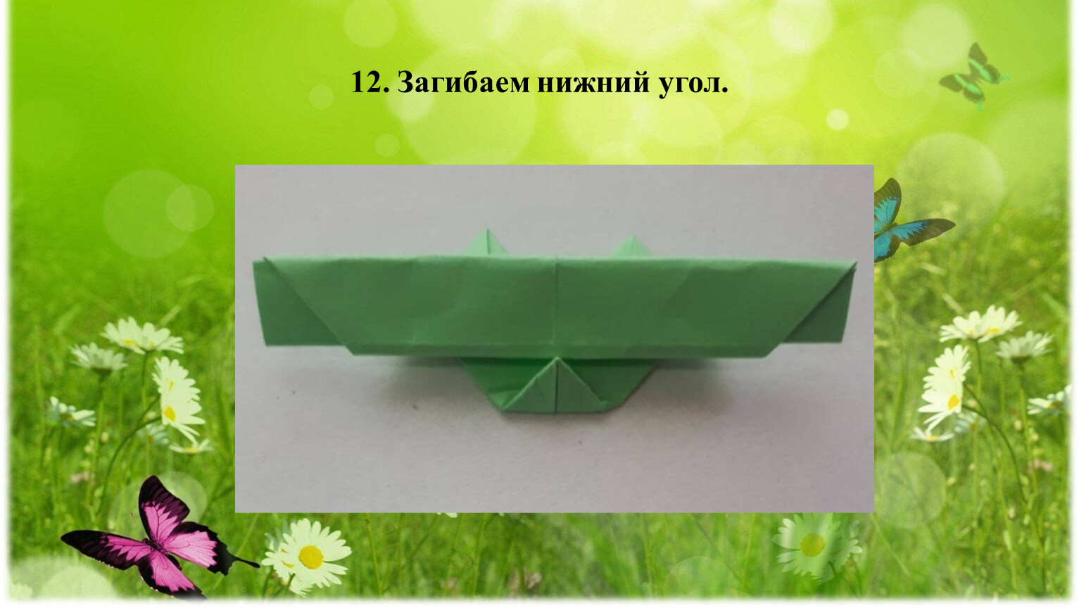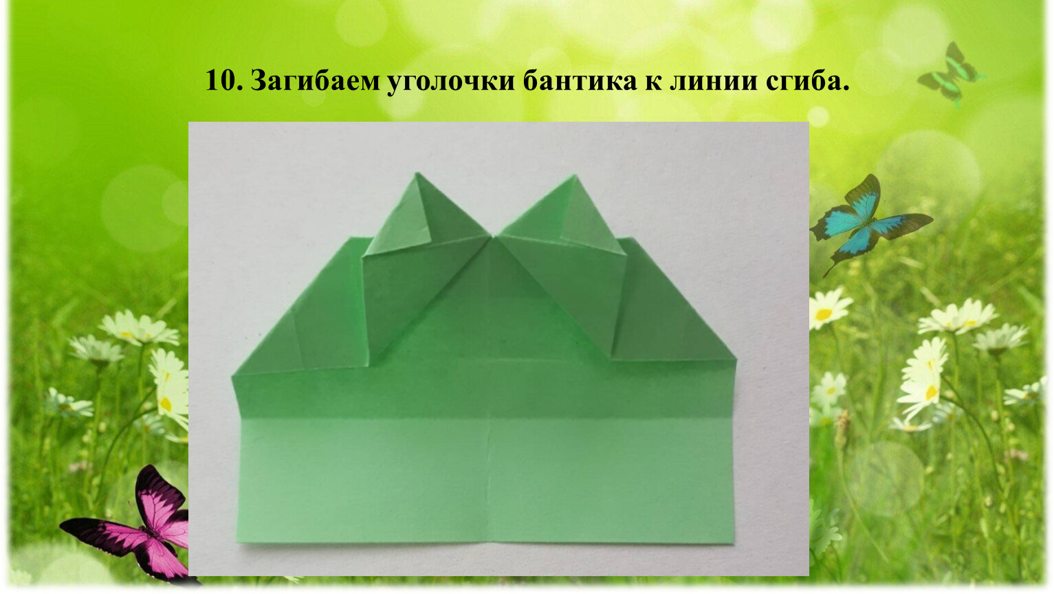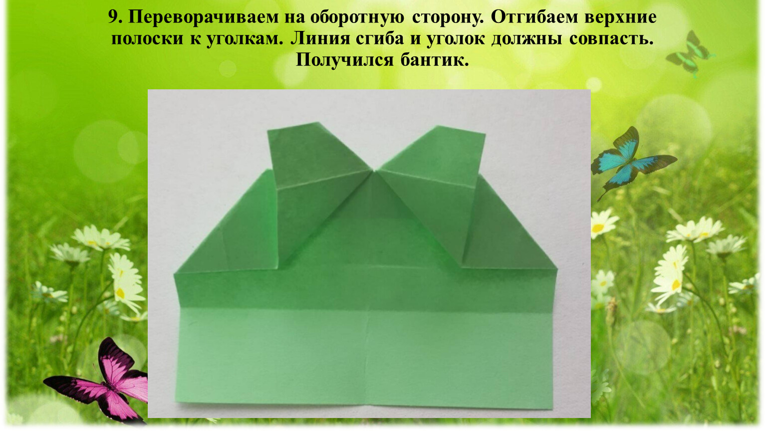 9. Переворачиваем на оборотную сторону. Отгибаем верхние полоски к уголкам. Линия сгиба и уголок должны совпасть. Получился бантик.