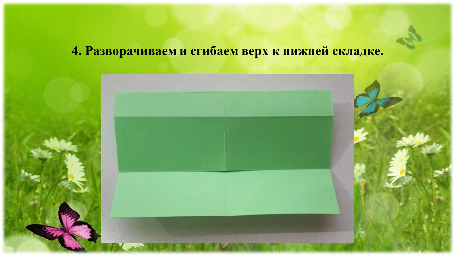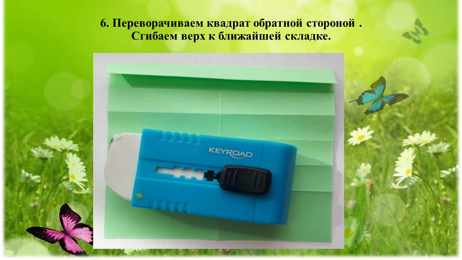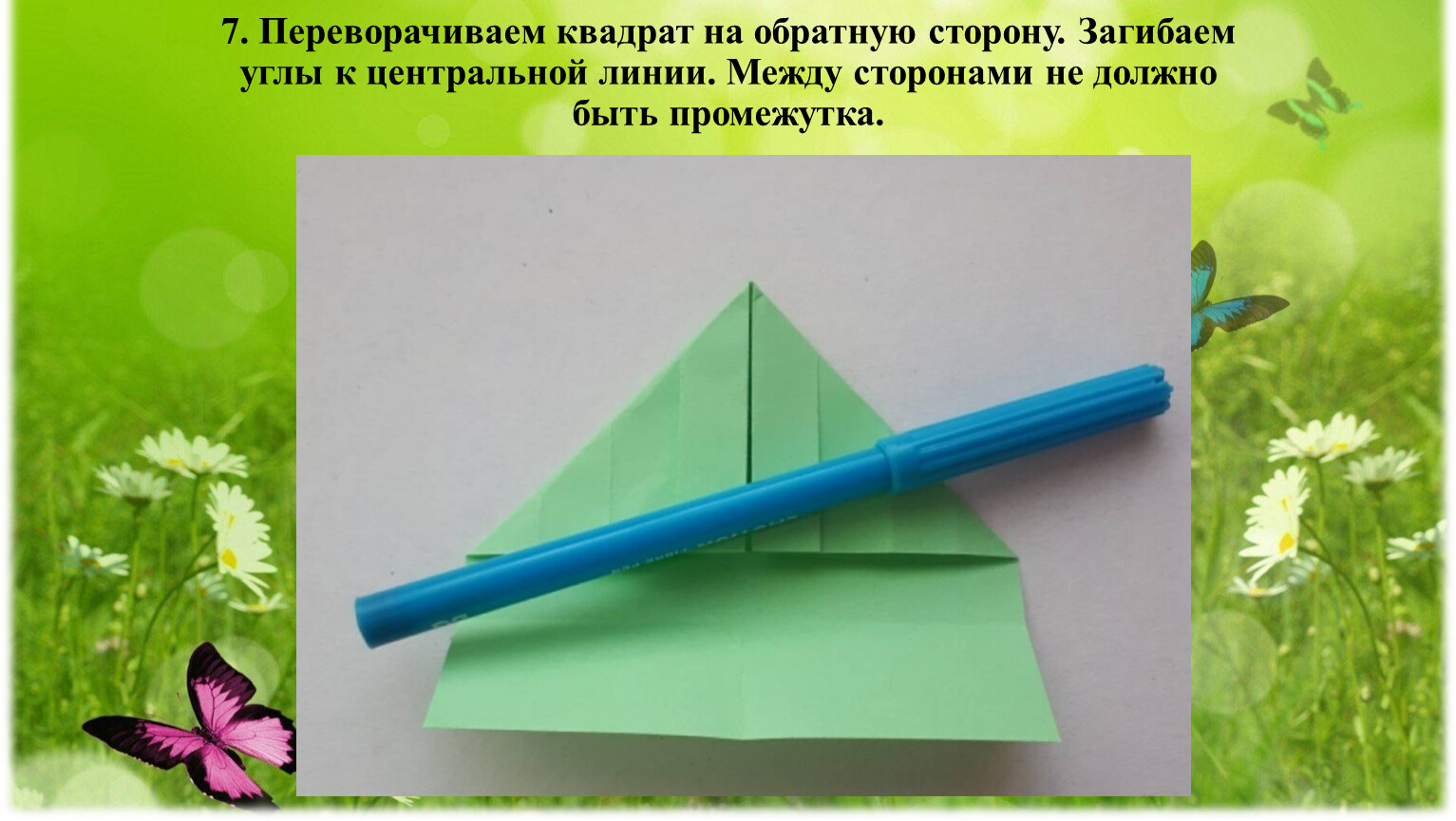 7. Переворачиваем квадрат на обратную сторону. Загибаем углы к центральной линии. Между сторонами не должно быть промежутка.