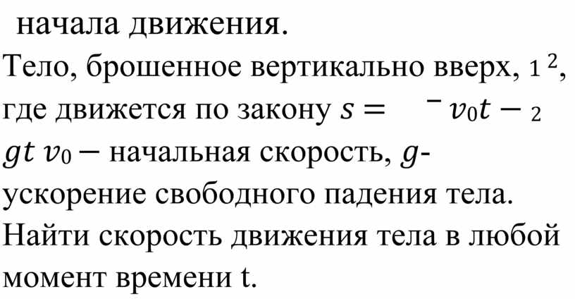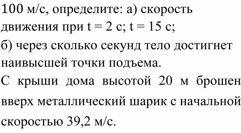 Найдите скорость движения тела в любой момент времени t. Полагая 𝑣0 = 100 м/с, определите: а) скорость движения при t = 2 с; t = 15 c;