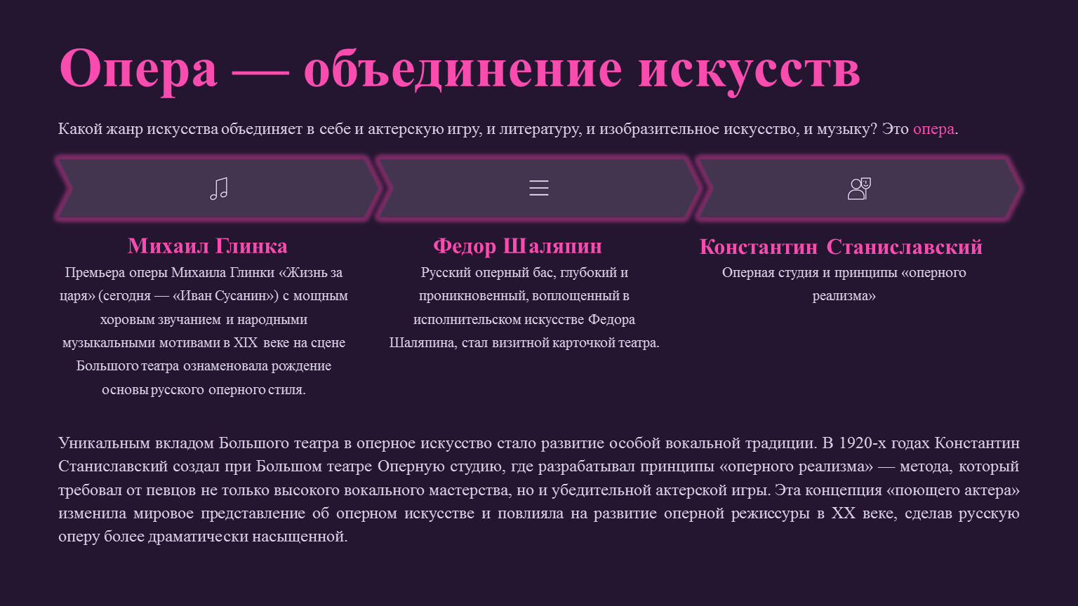 Русский оперный бас, глубокий и проникновенный, воплощенный в исполнительском искусстве Федора Шаляпина, стал визитной карточкой театра.