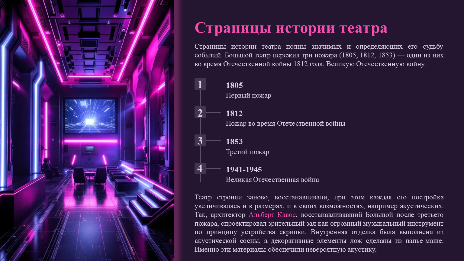 Театр строили заново, восстанавливали, при этом каждая его постройка увеличивалась и в размерах, и в своих возможностях, например акустических. Так, архитектор Альберт Кавос, восстанавливавший Большой после третьего пожара, спроектировал зрительный зал как огромный музыкальный инструмент по принципу устройства скрипки. Внутренняя отделка была выполнена из акустической сосны, а декоративные элементы лож сделаны из папье-маше. Именно эти материалы обеспечили невероятную акустику.