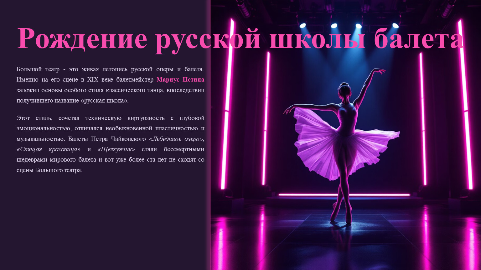 Большой театр - это живая летопись русской оперы и балета. Именно на его сцене в XIX веке балетмейстер Мариус Петипа заложил основы особого стиля классического танца, впоследствии получившего название «русская школа».