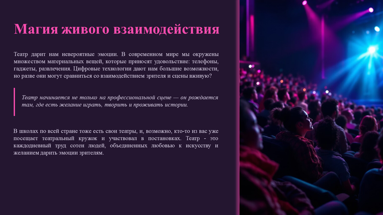 Театр дарит нам невероятные эмоции. В современном мире мы окружены множеством материальных вещей, которые приносят удовольствие: телефоны, гаджеты, развлечения. Цифровые технологии дают нам большие возможности, но разве они могут сравниться со взаимодействием зрителя и сцены вживую?