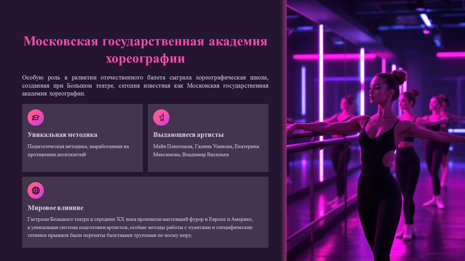 Особую роль в развитии отечественного балета сыграла хореографическая школа, созданная при Большом театре, сегодня известная как Московская государственная академия хореографии.