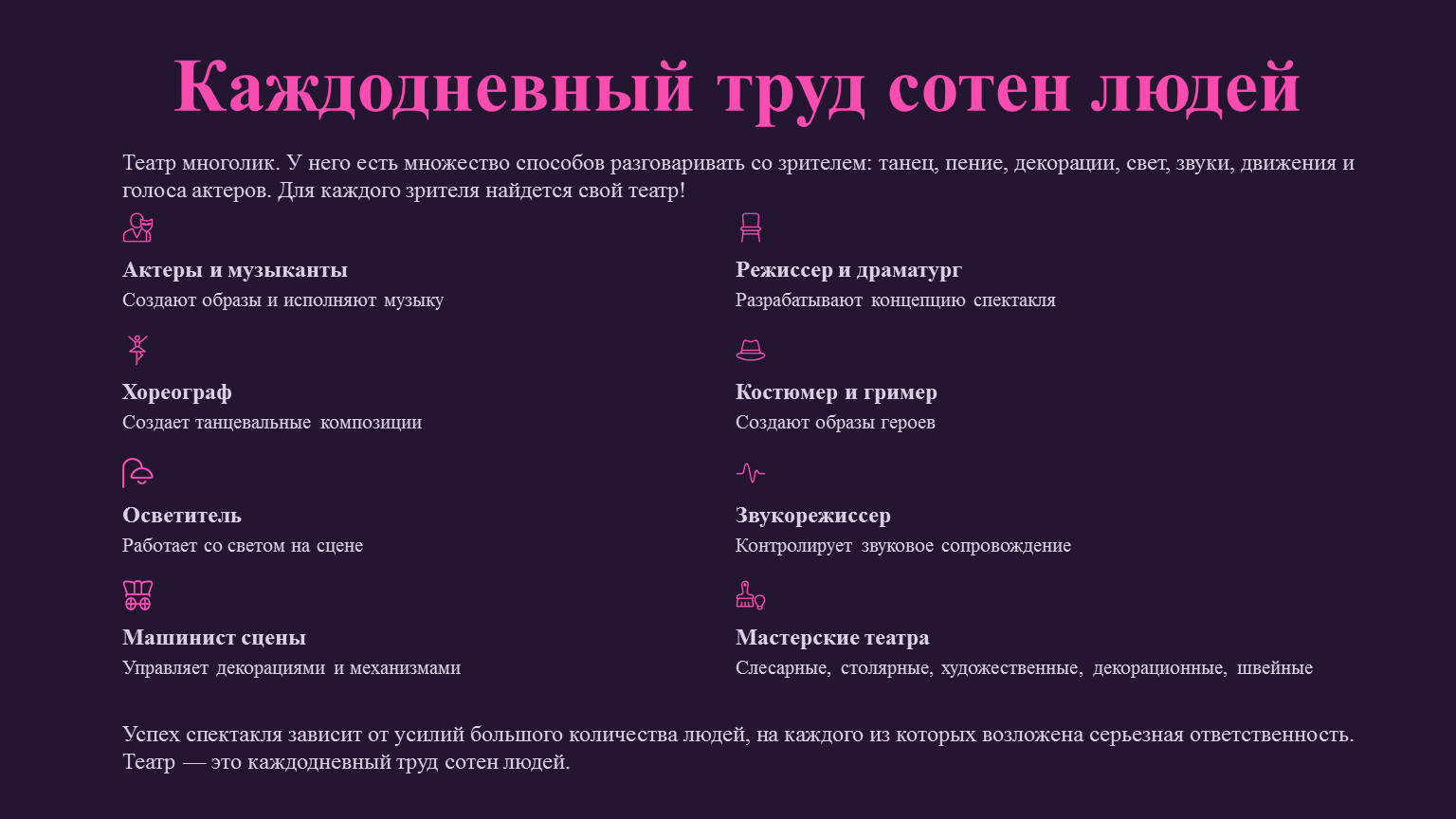 Успех спектакля зависит от усилий большого количества людей, на каждого из которых возложена серьезная ответственность. Театр — это каждодневный труд сотен людей.