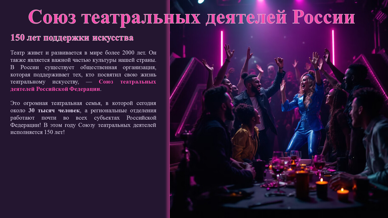 Театр живет и развивается в мире более 2000 лет. Он также является важной частью культуры нашей страны. В России существует общественная организация, которая поддерживает тех, кто посвятил свою жизнь театральному искусству, — Союз театральных деятелей Российской Федерации.