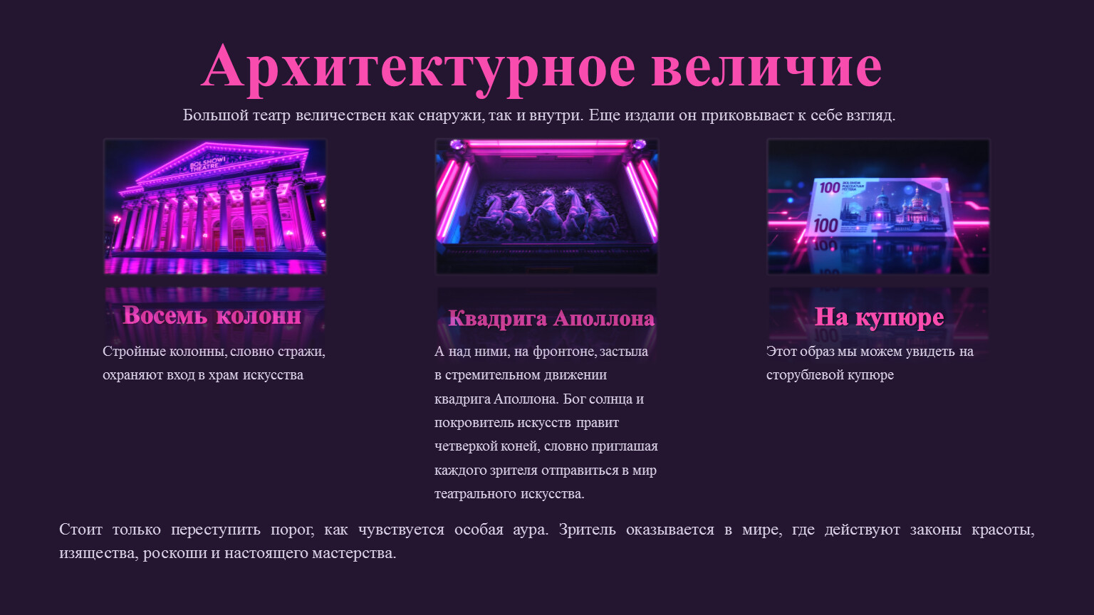 А над ними, на фронтоне, застыла в стремительном движении квадрига Аполлона. Бог солнца и покровитель искусств правит четверкой коней, словно приглашая каждого зрителя отправиться в мир театрального искусства.