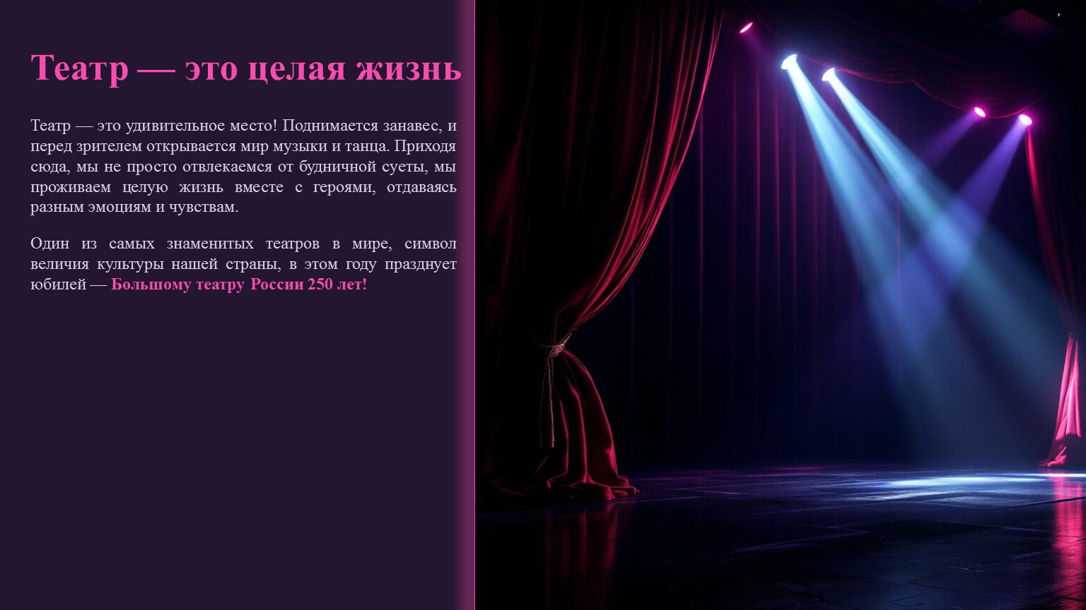 Театр — это удивительное место! Поднимается занавес, и перед зрителем открывается мир музыки и танца. Приходя сюда, мы не просто отвлекаемся от будничной суеты, мы проживаем целую жизнь вместе с героями, отдаваясь разным эмоциям и чувствам.