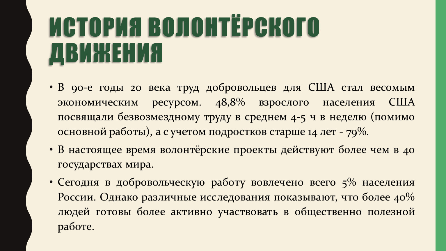 Сегодня в добровольческую работу вовлечено всего 5% населения России. Однако различные исследования показывают, что более 40% людей готовы более активно участвовать в общественно полезной работе.