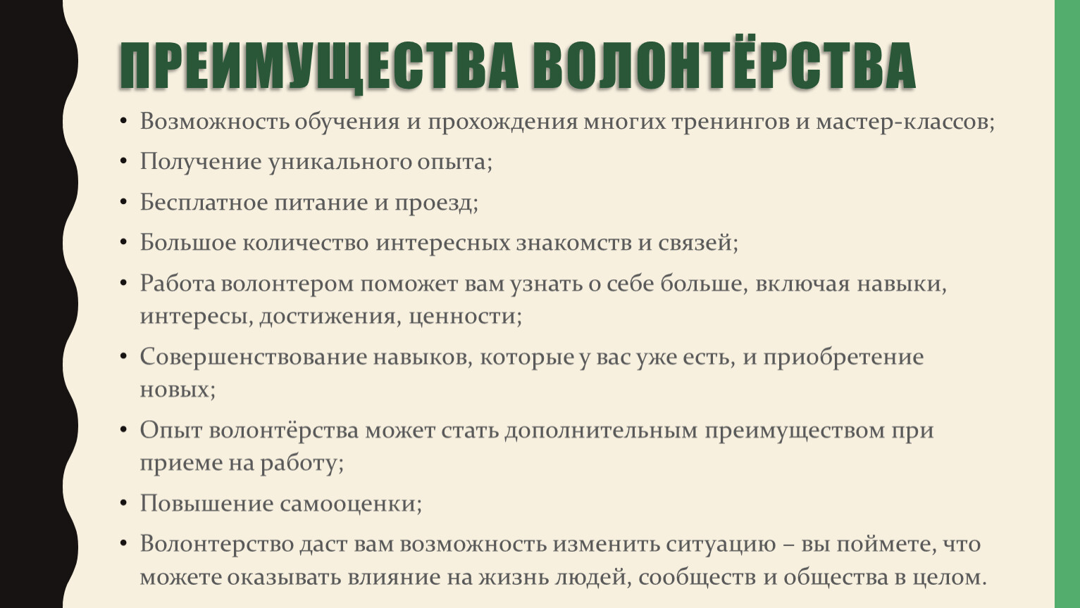 Опыт волонтёрства может стать дополнительным преимуществом при приеме на работу;