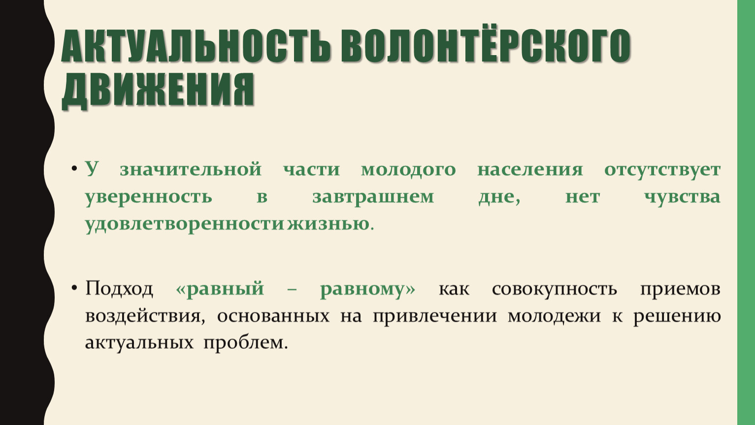 Подход «равный – равному» как совокупность приемов воздействия, основанных на привлечении молодежи к решению актуальных проблем.