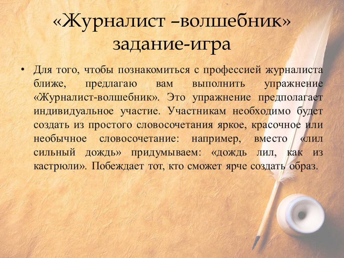 Для того, чтобы познакомиться с профессией журналиста ближе, предлагаю вам выполнить упражнение «Журналист-волшебник». Это упражнение предполагает индивидуальное участие. Участникам необходимо будет создать из простого словосочетания яркое, красочное или необычное словосочетание: например, вместо «лил сильный дождь» придумываем: «дождь лил, как из кастрюли». Побеждает тот, кто сможет ярче создать образ.