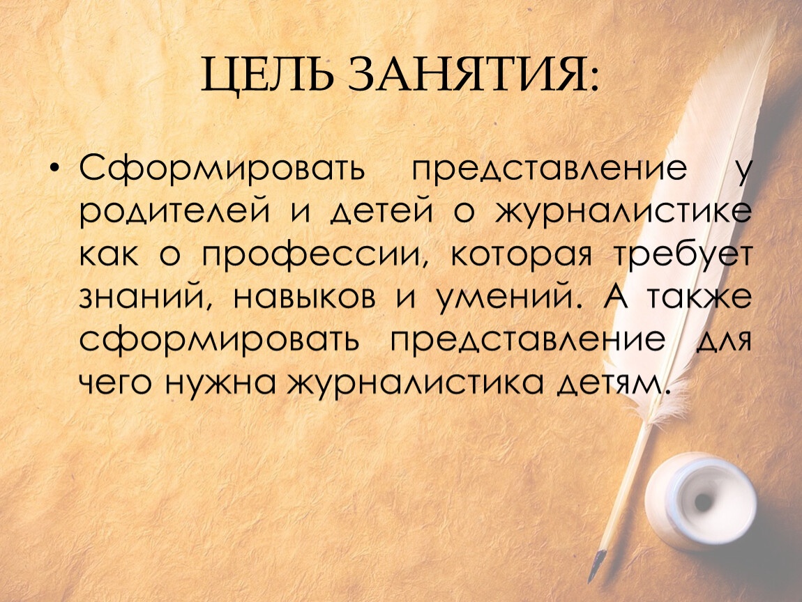 Сформировать представление у родителей и детей о журналистике как о профессии, которая требует знаний, навыков и умений. А также сформировать представление для чего нужна журналистика детям.
