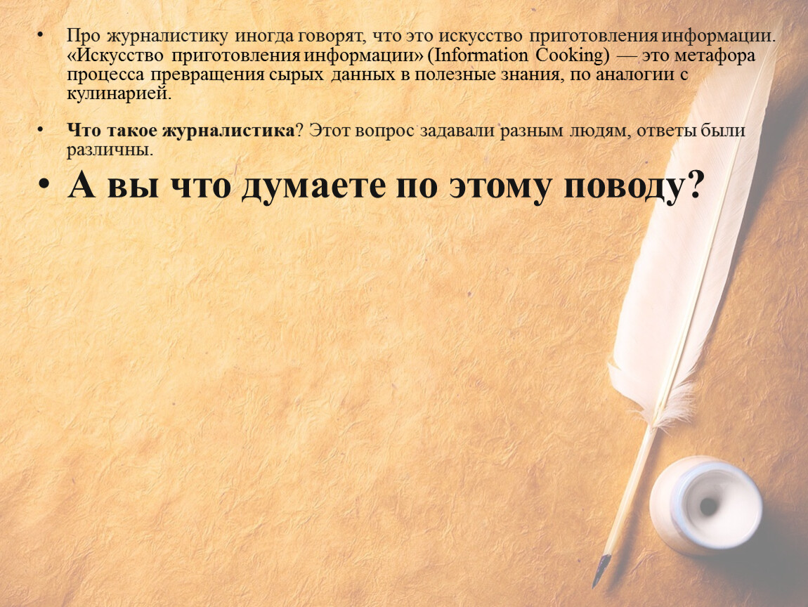 Про журналистику иногда говорят, что это искусство приготовления информации. «Искусство приготовления информации» (Information Cooking) — это метафора процесса превращения сырых данных в полезные знания, по аналогии с кулинарией.