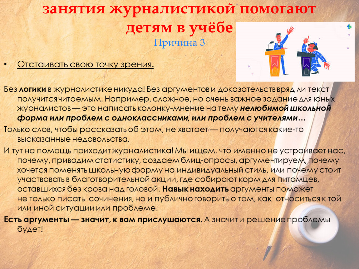 И тут на помощь приходит журналистика! Мы ищем, что именно не устраивает нас, почему, приводим статистику, создаем блиц-опросы, аргументируем, почему хочется поменять школьную форму на индивидуальный стиль, или почему стоит участвовать в благотворительной акции, где собирают корм для питомцев, оставшихся без крова над головой. Навык находить аргументы поможет не только писать сочинения, но и публично говорить о том, как относиться к той или иной ситуации или проблеме.