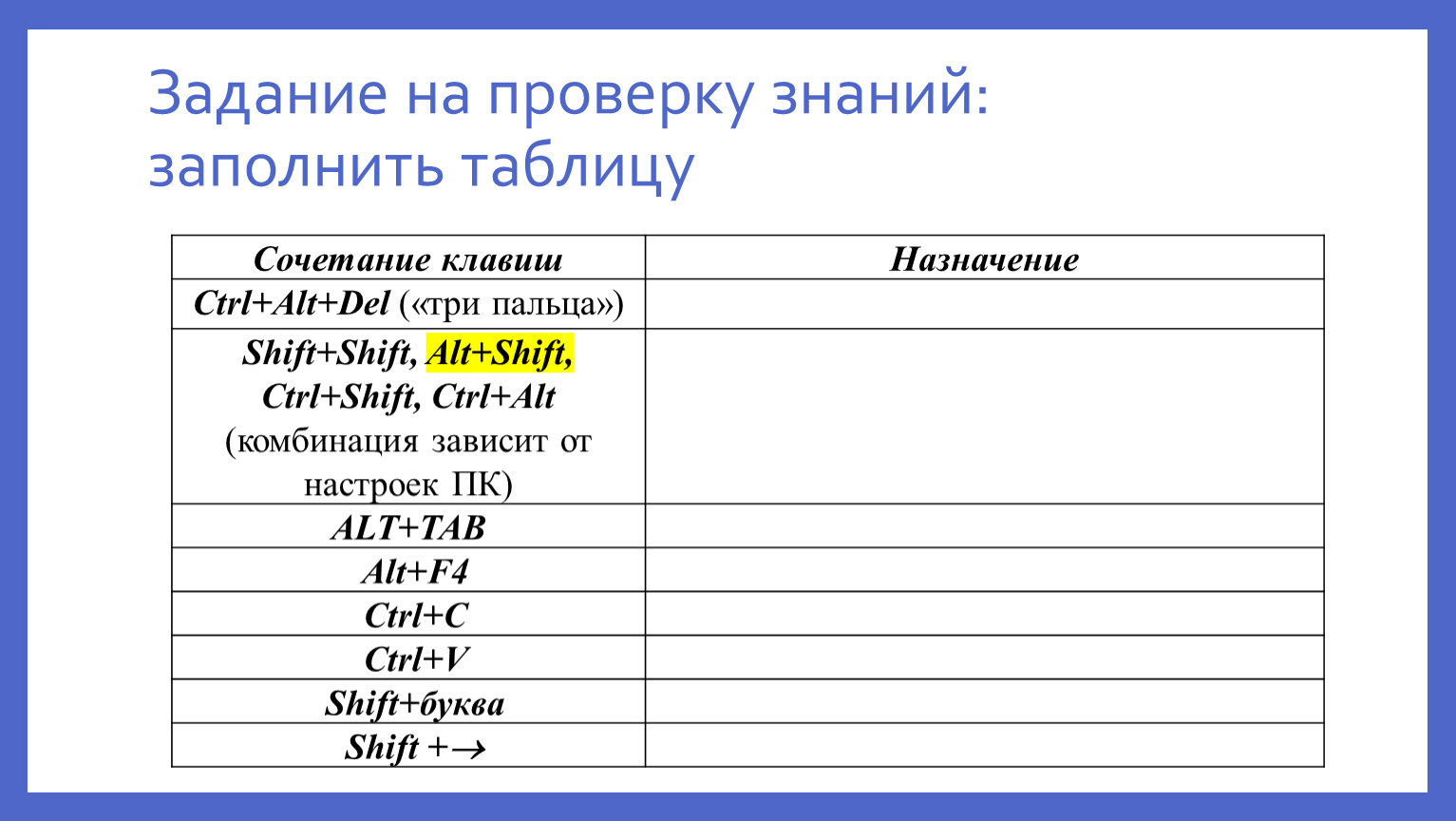 Задание на проверку знаний: заполнить таблицу
