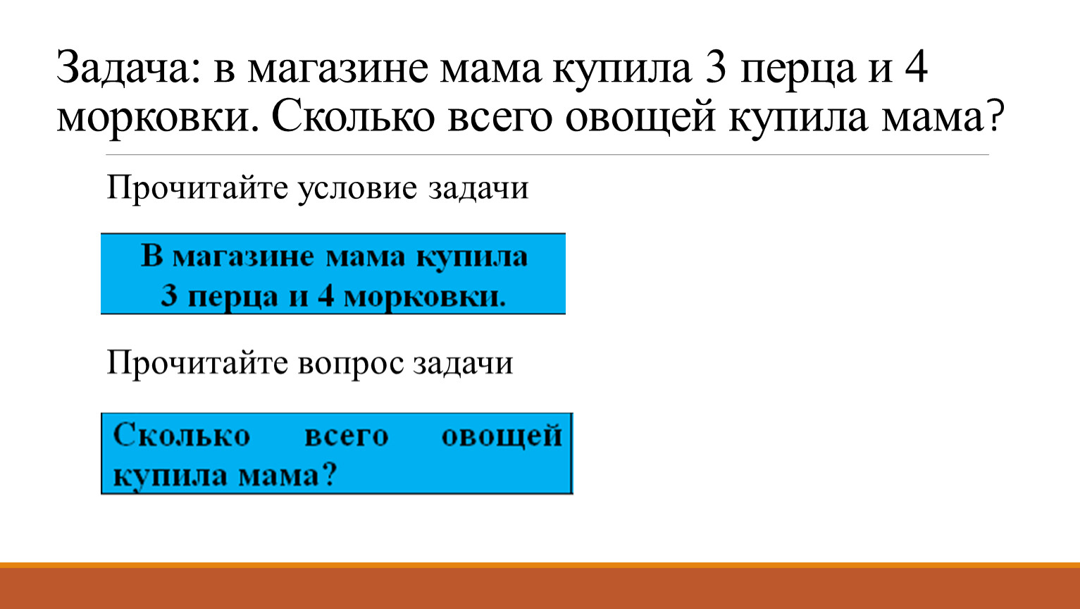 Задача: в магазине мама купила 3 перца и 4 морковки. Сколько всего овощей купила мама?
