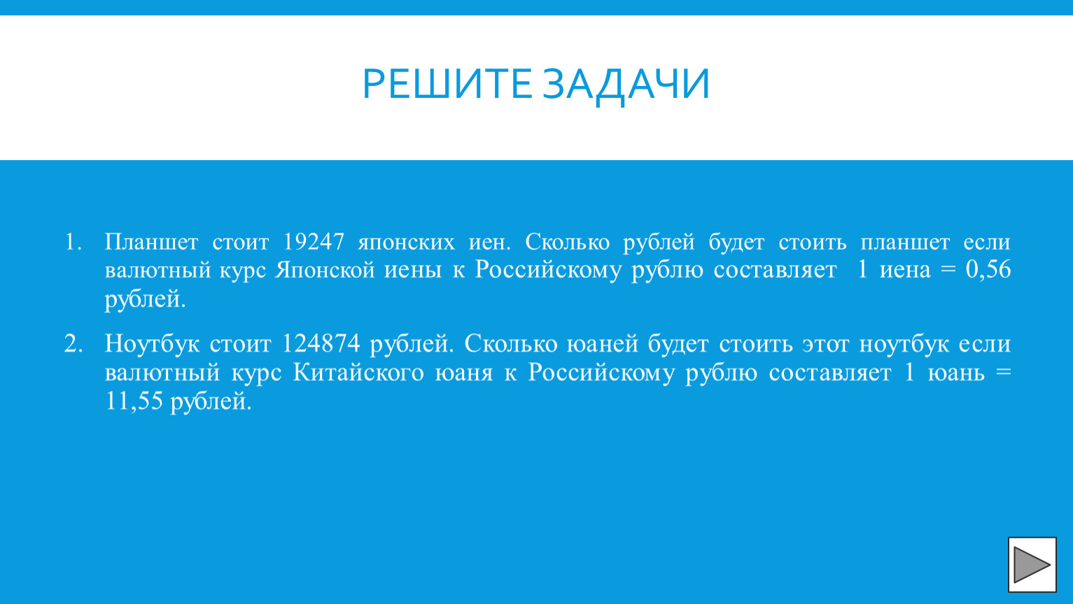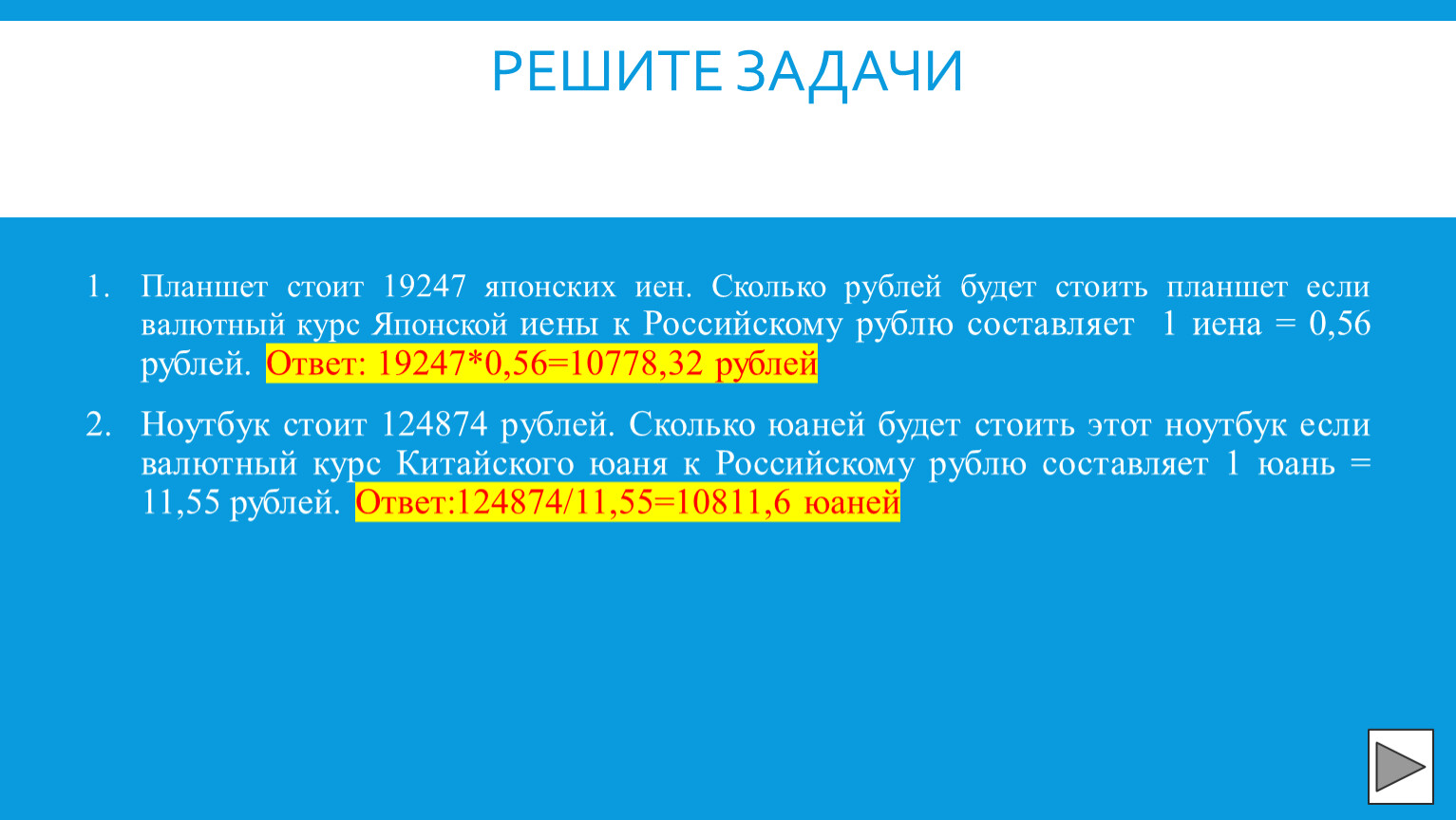 Планшет стоит 19247 японских иен. Сколько рублей будет стоить планшет если валютный курс Японской иены к Российскому рублю составляет 1 иена = 0,56 рублей. Ответ: 19247*0,56=10778,32 рублей