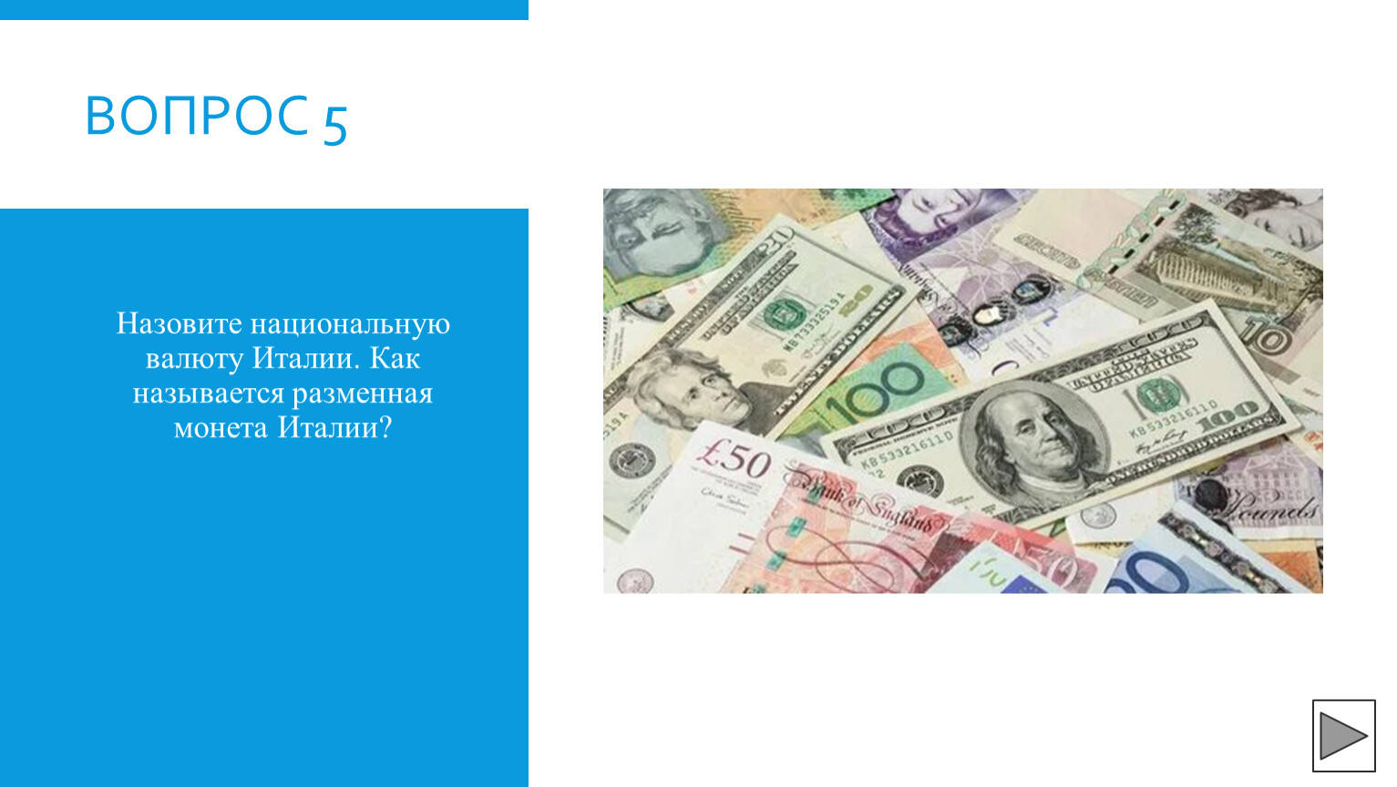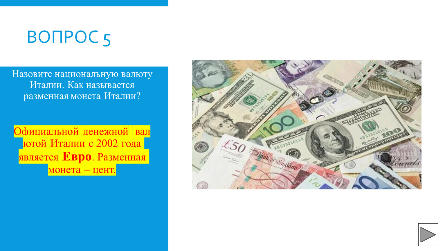 Назовите национальную валюту Италии. Как называется разменная монета Италии?