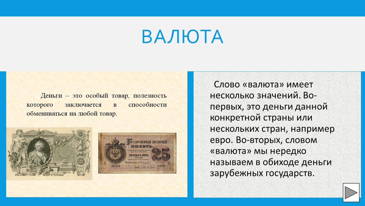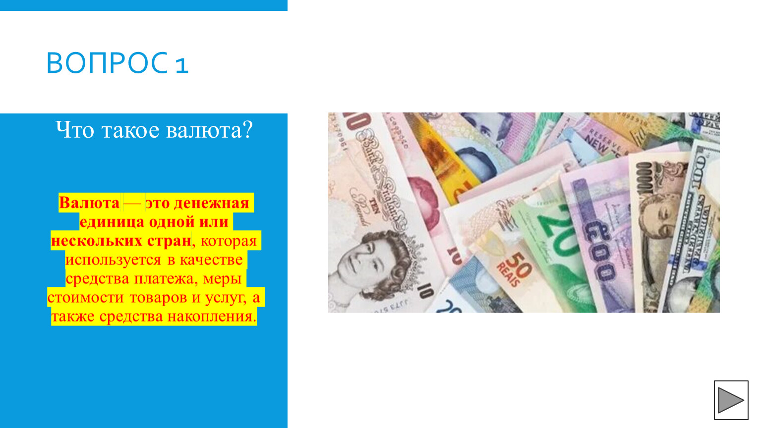 Валюта — это денежная единица одной или нескольких стран, которая используется в качестве средства платежа, меры стоимости товаров и услуг, а также средства накопления.