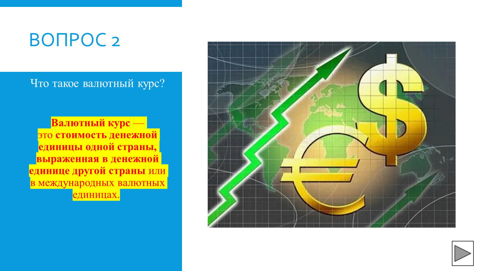 Валютный курс — это стоимость денежной единицы одной страны, выраженная в денежной единице другой страны или в международных валютных единицах.