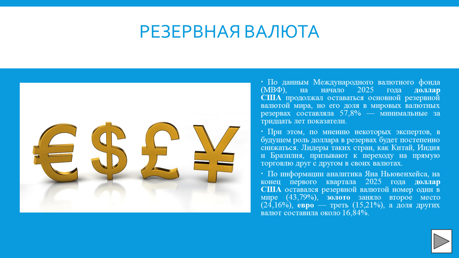 По данным Международного валютного фонда (МВФ), на начало 2025 года доллар США продолжал оставаться основной резервной валютой мира, но его доля в мировых валютных резервах составляла 57,8% — минимальные за тридцать лет показатели.