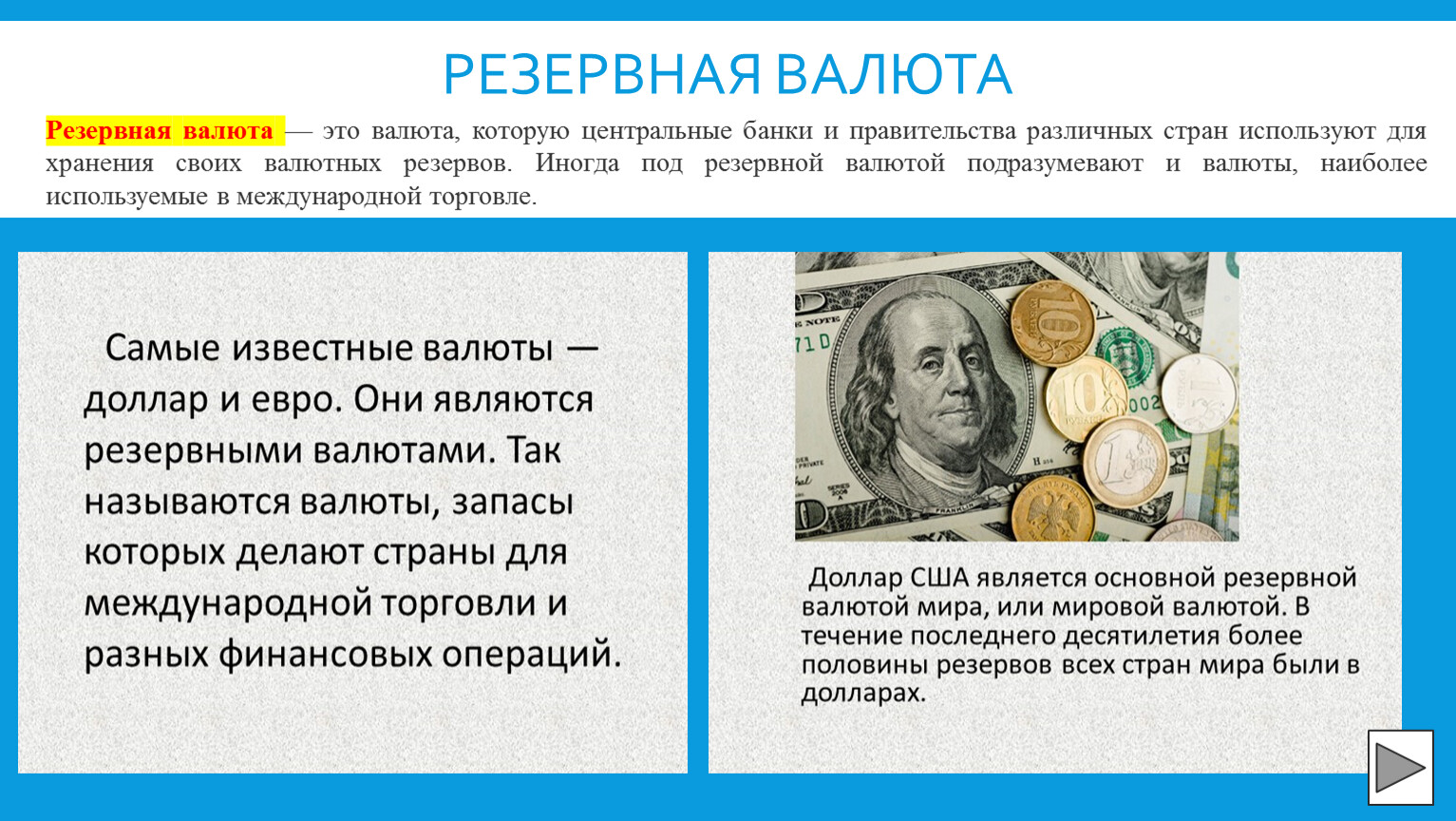 Резервная валюта — это валюта, которую центральные банки и правительства различных стран используют для хранения своих валютных резервов. Иногда под резервной валютой подразумевают и валюты, наиболее используемые в международной торговле.