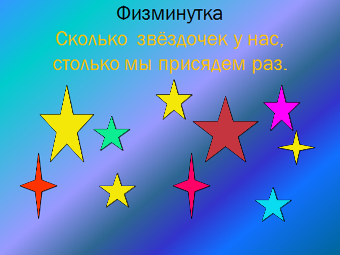 ФизминуткаСколько звёздочек у нас, столько мы присядем раз.