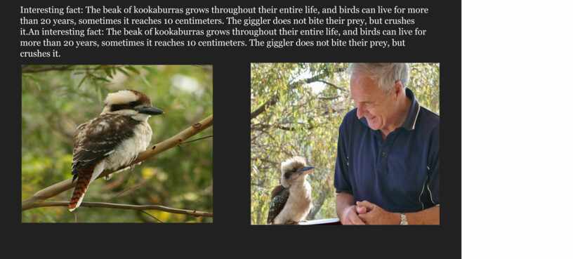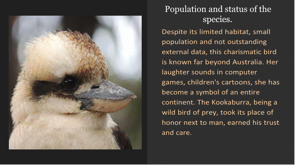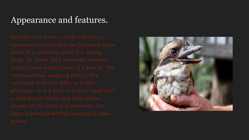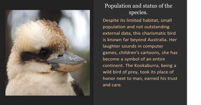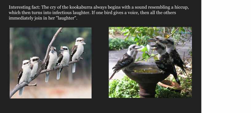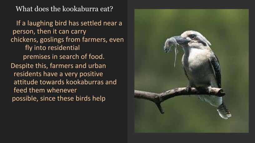 The Kookaburra is especially loved by Australians, it is a symbol of the continent along with the kangaroo. If a laughing bird has settled near human habitation, then this sociable creature is often perceived on a par with a domestic cat or dog, they will definitely protect and feed.