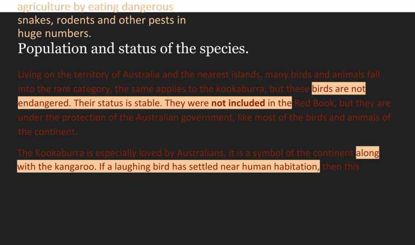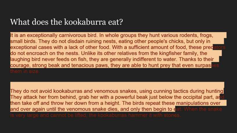 They do not avoid kookaburras and venomous snakes, using cunning tactics during hunting. They attack her from behind, grab her with a powerful beak just below the occipital part, and then take off and throw her down from a height. The birds repeat these manipulations over and over again until the venomous snake dies, and only then begin to eat. When the snake is very large and cannot be lifted, the kookaburras hammer it with stones.