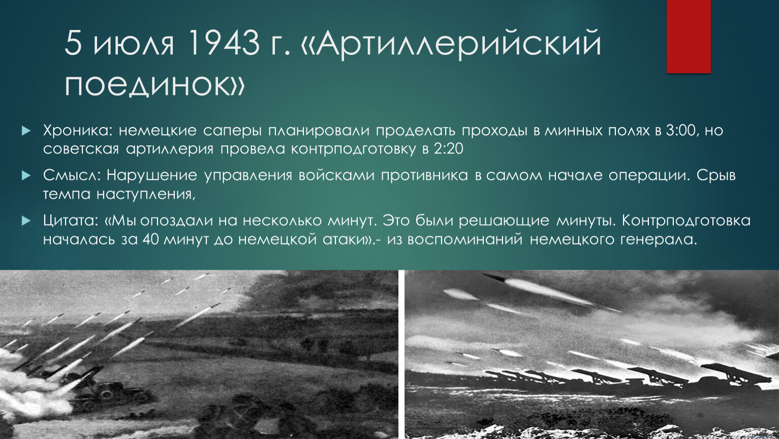 Цитата: «Мы опоздали на несколько минут. Это были решающие минуты. Контрподготовка началась за 40 минут до немецкой атаки».- из воспоминаний немецкого генерала.