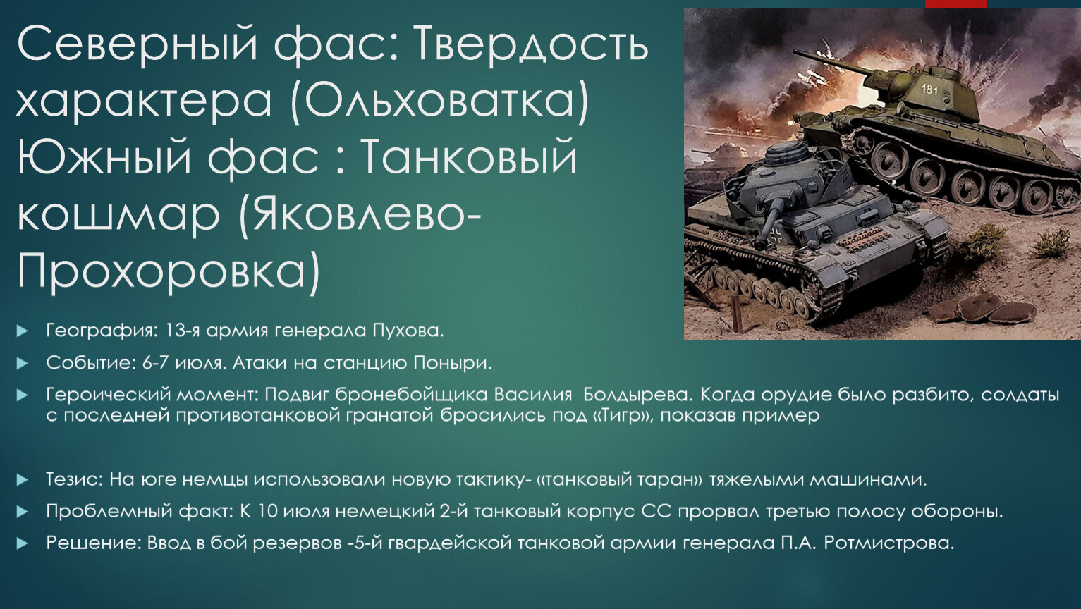 Тезис: На юге немцы использовали новую тактику- «танковый таран» тяжелыми машинами.